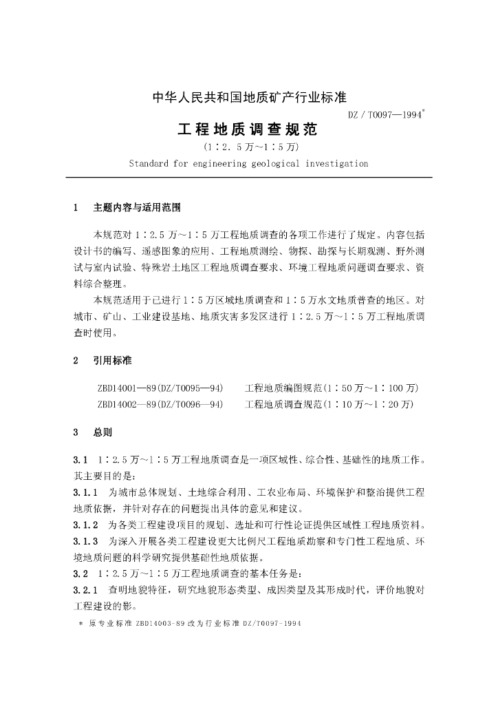 DZ/T 0097-1994 工程地质调查规范(1:2.5万~1:5万)