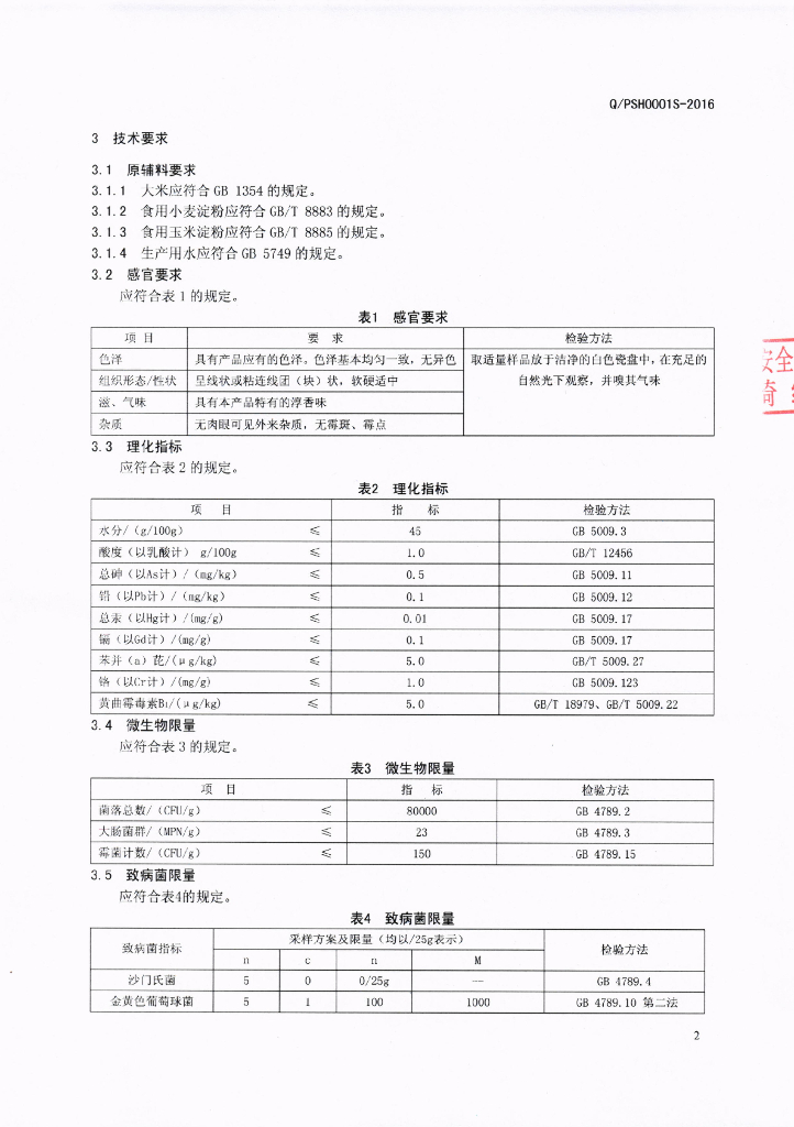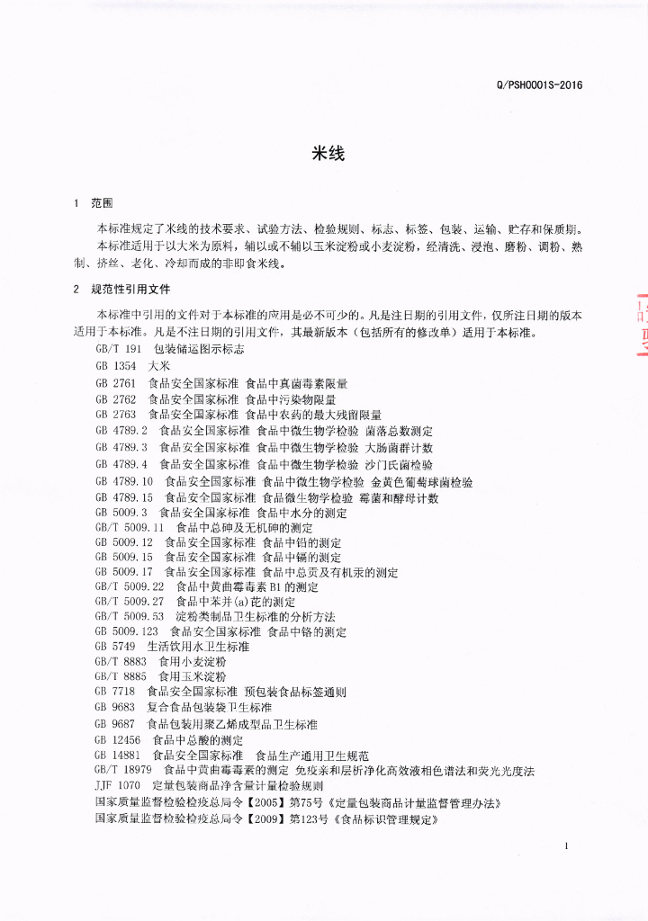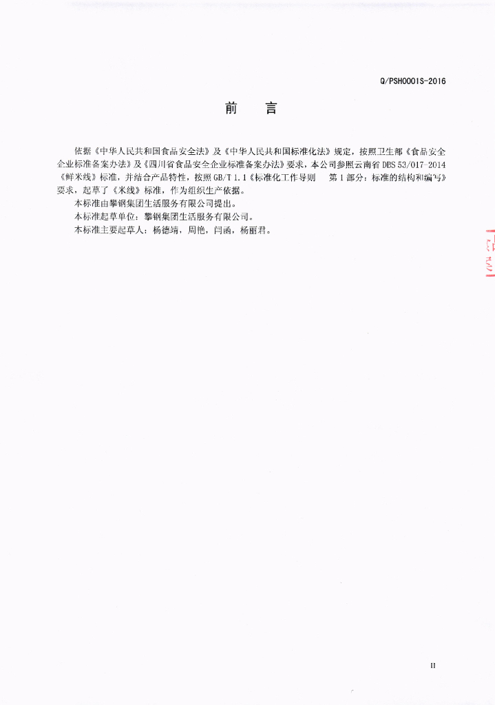 Q/PSH 0001S-2016 攀钢集团生活服务有限公司 米线