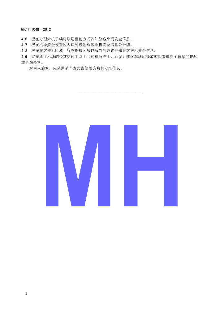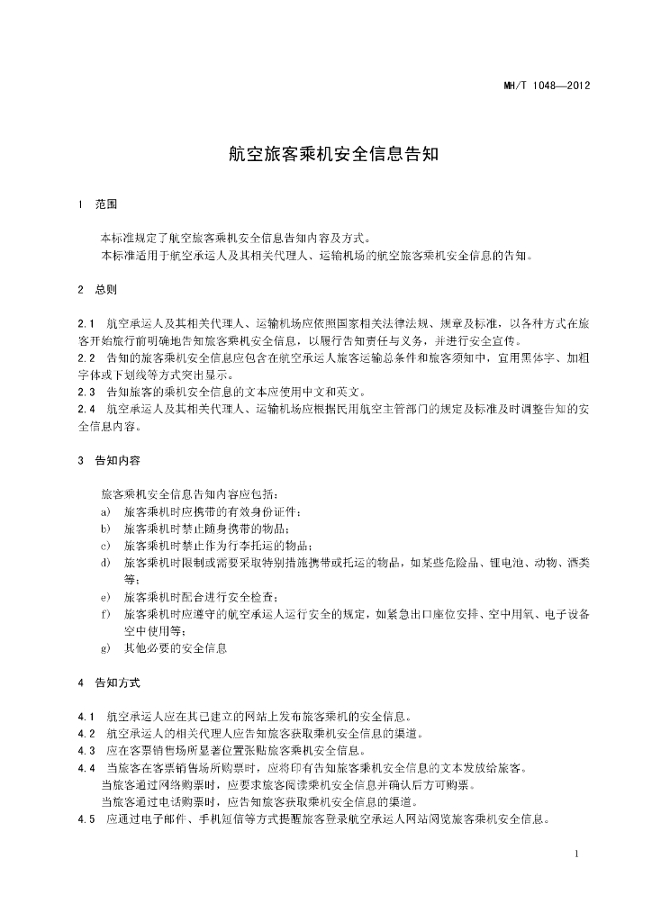 MH/T 1048-2012 航空旅客乘机安全信息告知