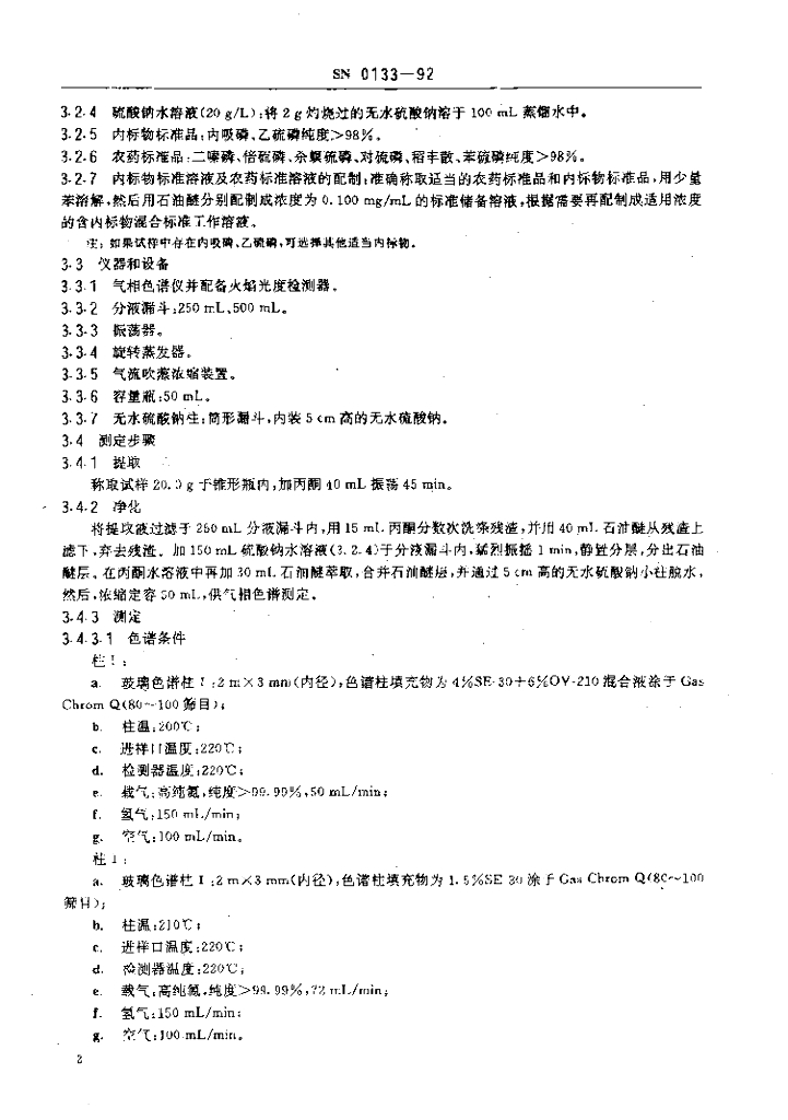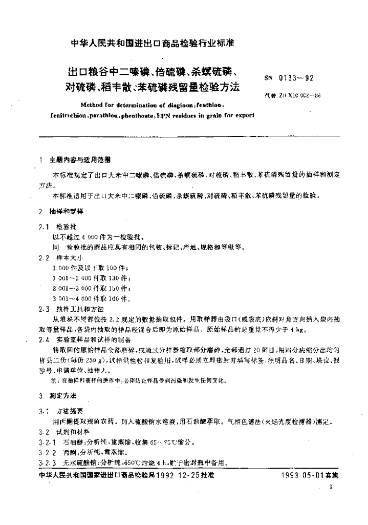 SN 0133-1992 出口粮谷中二嗪磷、倍硫磷、杀螟硫磷、对硫磷、稻丰散、苯硫磷残留量检验方法