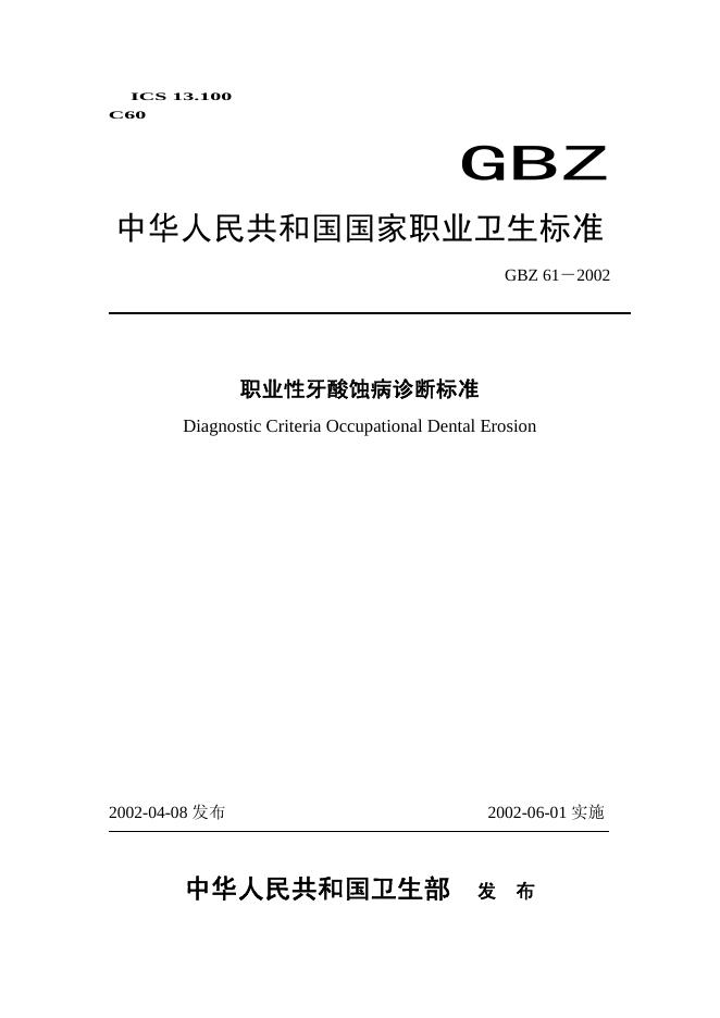 GBZ 61-2002 职业性牙酸蚀病诊断标准