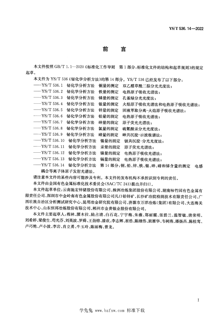 云南驰宏锌锗股份有限公司、株洲冶炼集团股份有限公司、湖南柿竹园有色金属有限责任公司、深圳市中金岭南有色金属股份有限公司凡口铅锌矿、长沙矿冶院检测技术有限责任公司、广西壮族自治区分析测试研究中心、昆明冶金研究院有限公司、济源市万洋冶炼(集团)有限公司、大连海关技术中心、山东恒邦冶炼股份有限公司、郴州市金贵银业股份有限公司