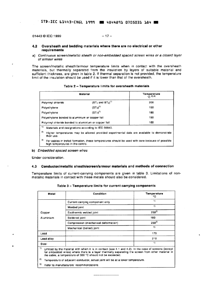 IEC 61443-1999 额定电压30kV(Um=36kV)以上电缆的短路温度极限值Short-circuit Temperature Limits of Electric Cables with rated Volta