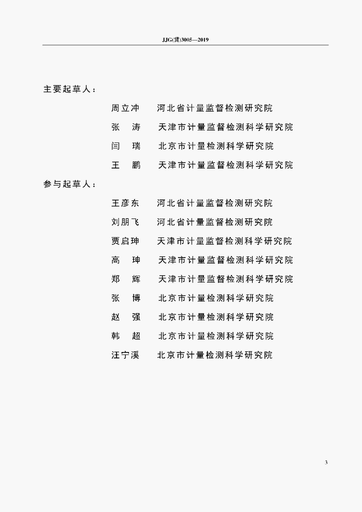 周立冲(河北省计量监督检测研究院)、张涛(天津市计量监督检测科学研究院)、闫瑞(北京市计量检测科学研究院)、王鹏(天津市计量监督检测科学研究院)、王彦东(河北省计量监督检测研究院)、刘朋飞(河北省计量监督检测研究院)、贾启珅(天津市计量监督检测科学研究院)、高珅(天津市计量监督检测科学研究院)、郑辉(天津市计量监督检测科学研究院)、张博(北京市计量检测科学研究院)、赵强(北京市计量检测科学研究院)、韩超(北京市计量检测科学研究院)、汪宁溪(北京市计量检测科学研究院)