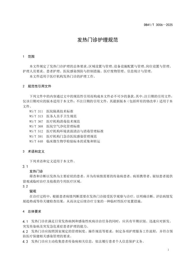 DB41/T 3006-2025 发热门诊护理规范
