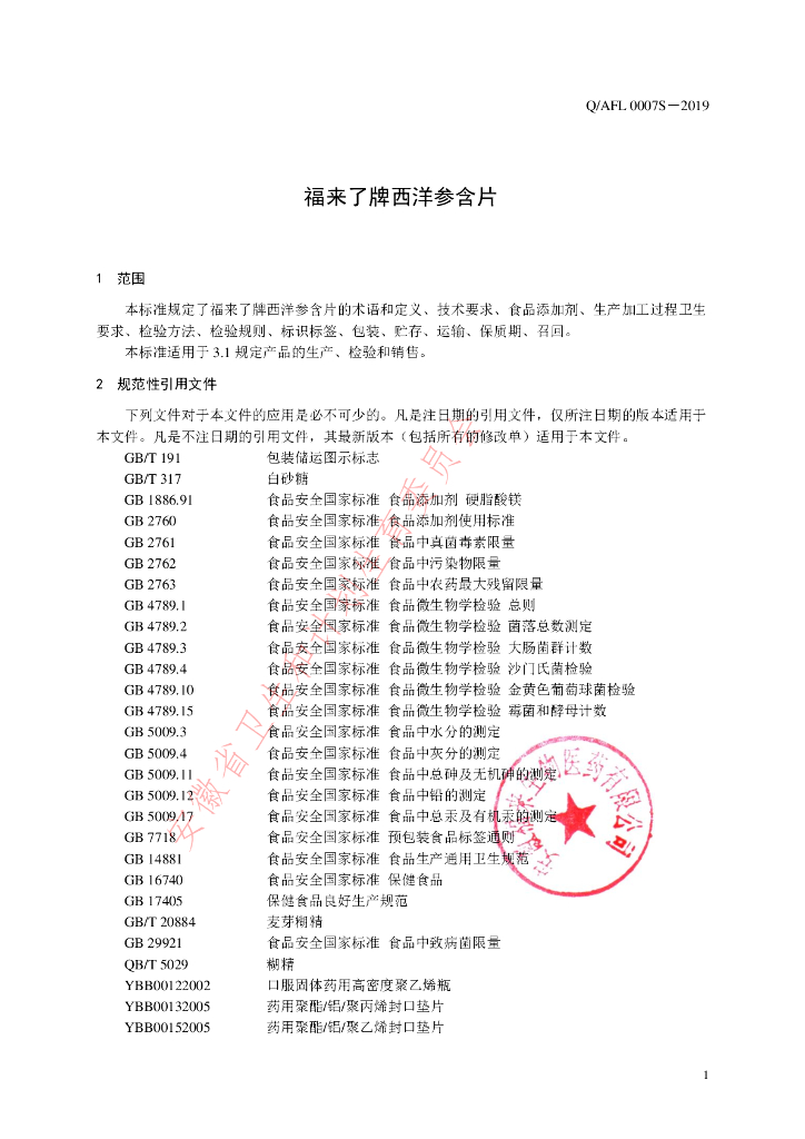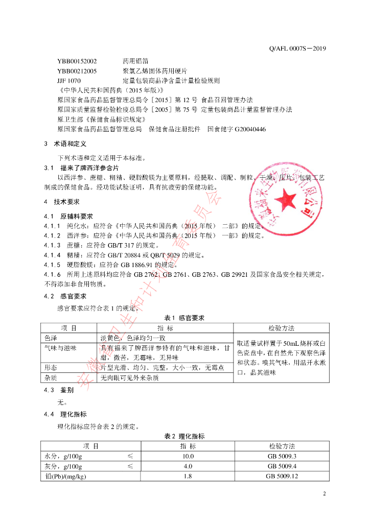 Q/AFL 0007S-2019 福来了牌西洋参含片