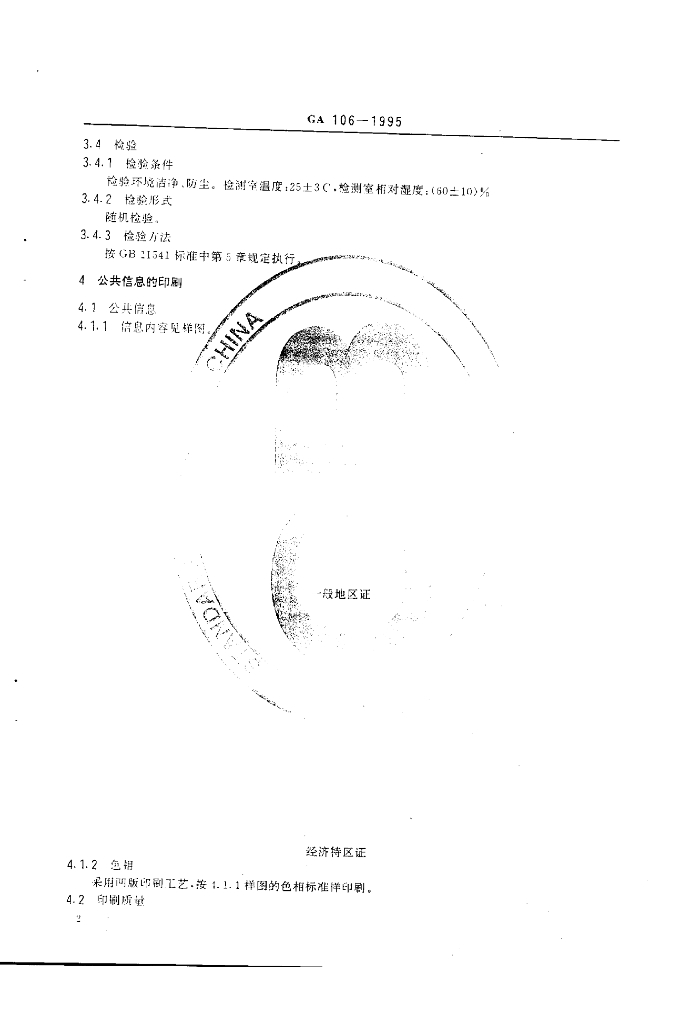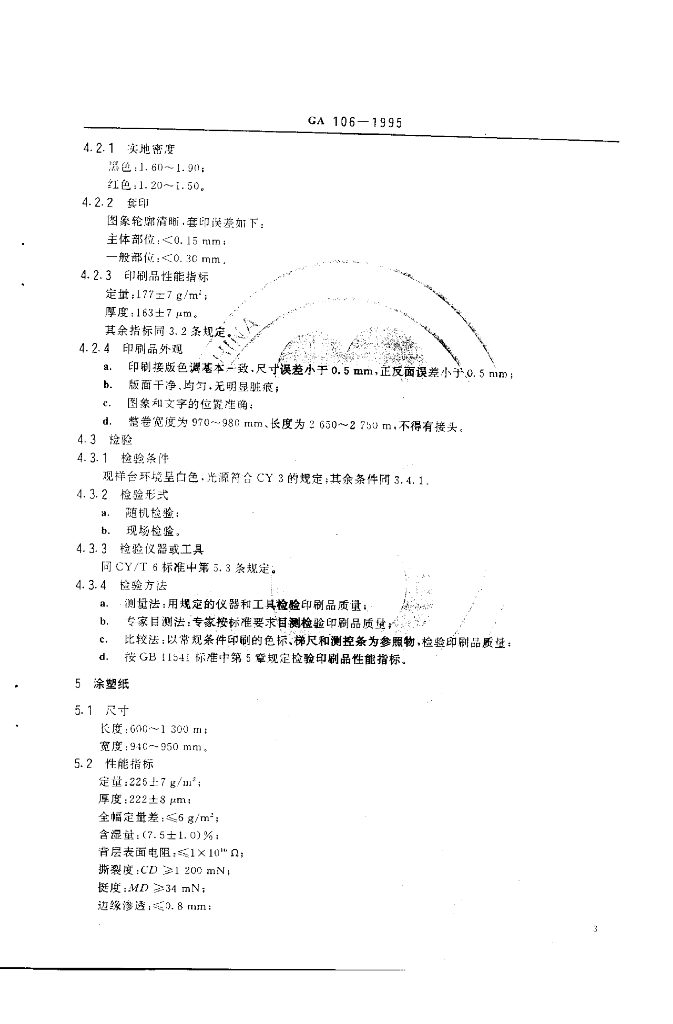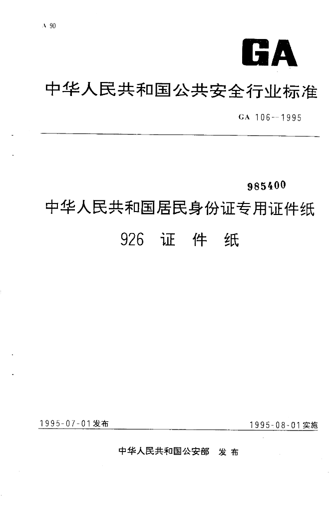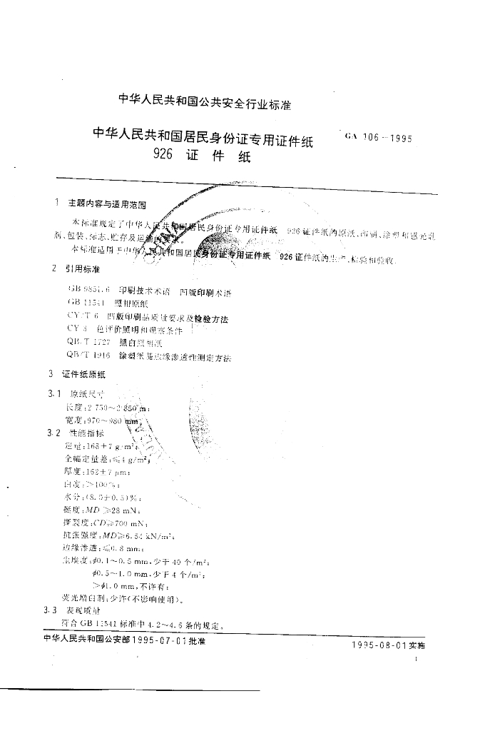 GA 106-1995 中华人民共和国居民身份证专用证件纸926证件纸