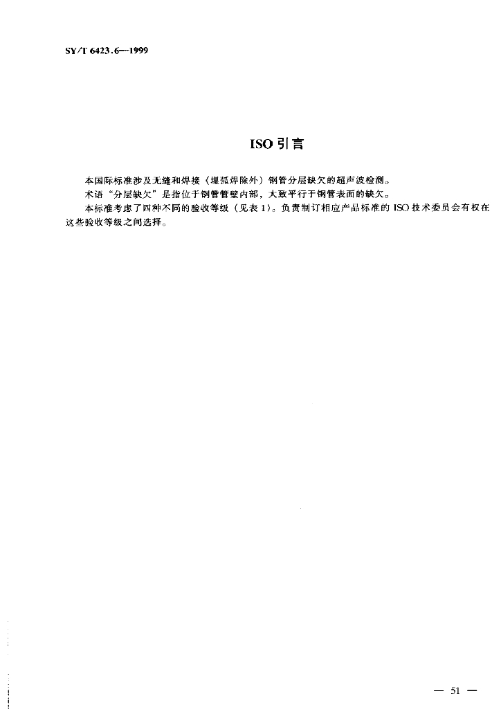 SY/T 6423.6-1999 石油天然气工业 承压钢管无损检测方法 无缝和焊接(埋弧焊除外)钢管分层缺欠的超声波检测