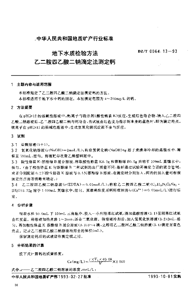 DZ/T 0064.13-1993 地下水质检验方法 乙二胺四乙酸二钠滴定法测定钙