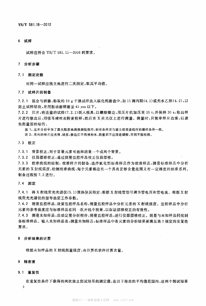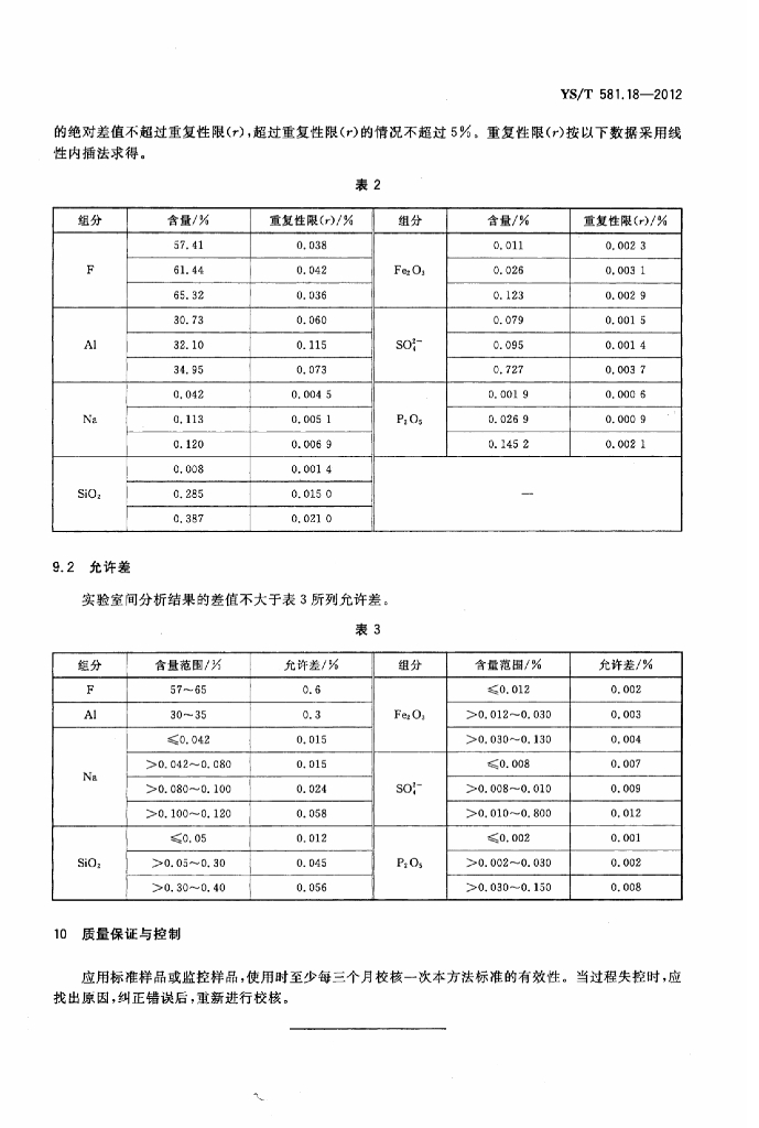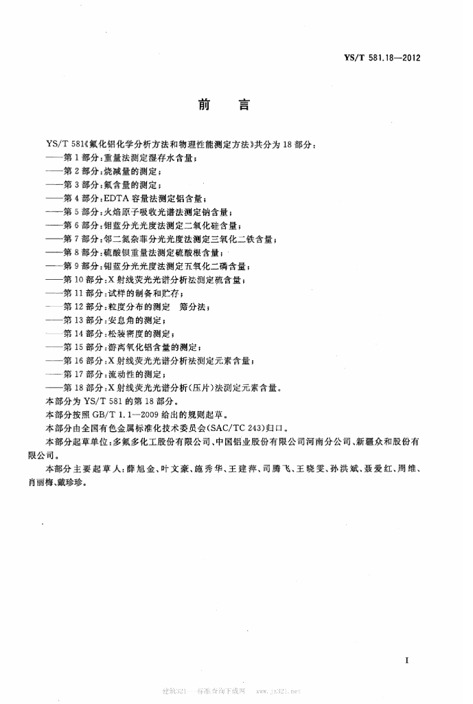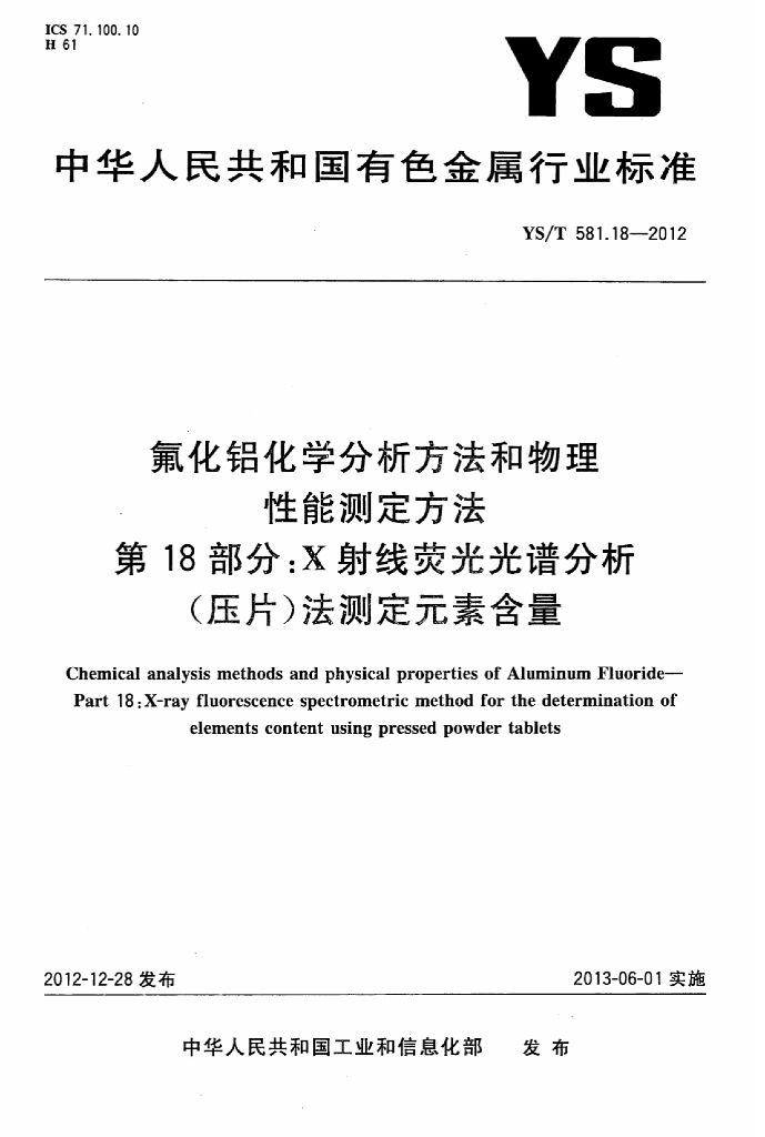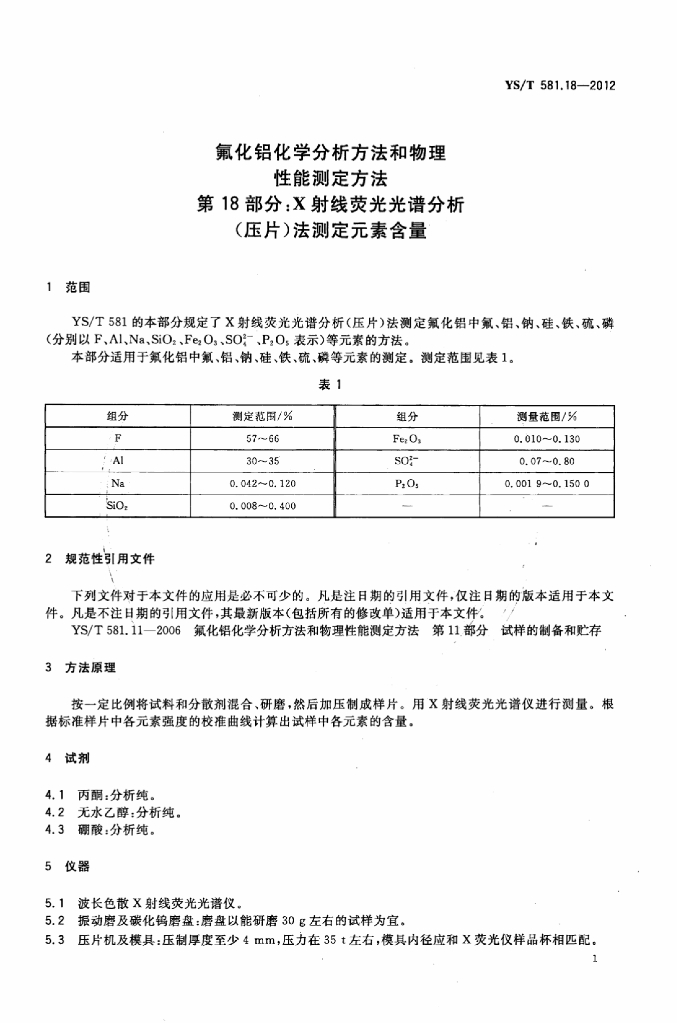 YS/T 581.18-2012 氟化铝化学分析方法和物理性能测定方法 第18部分: X射线荧光光谱分析(压片)法测定元素含量
