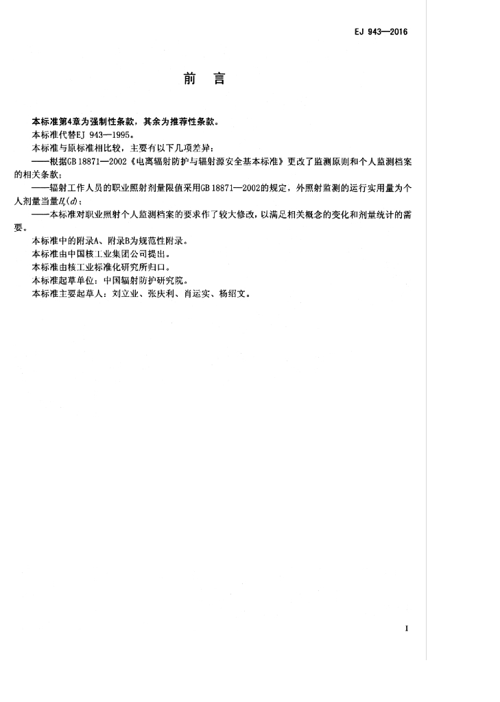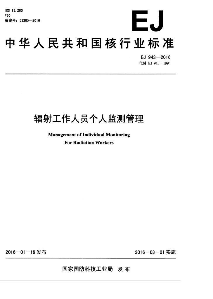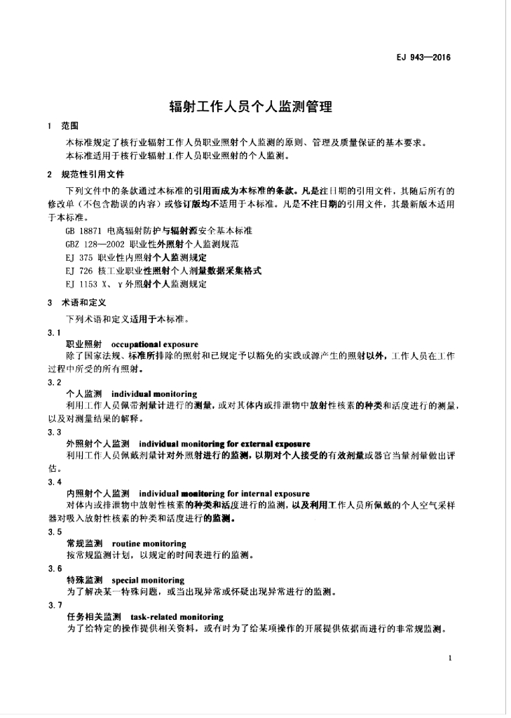 EJ 943-2016 辐射工作人员个人监测管理
