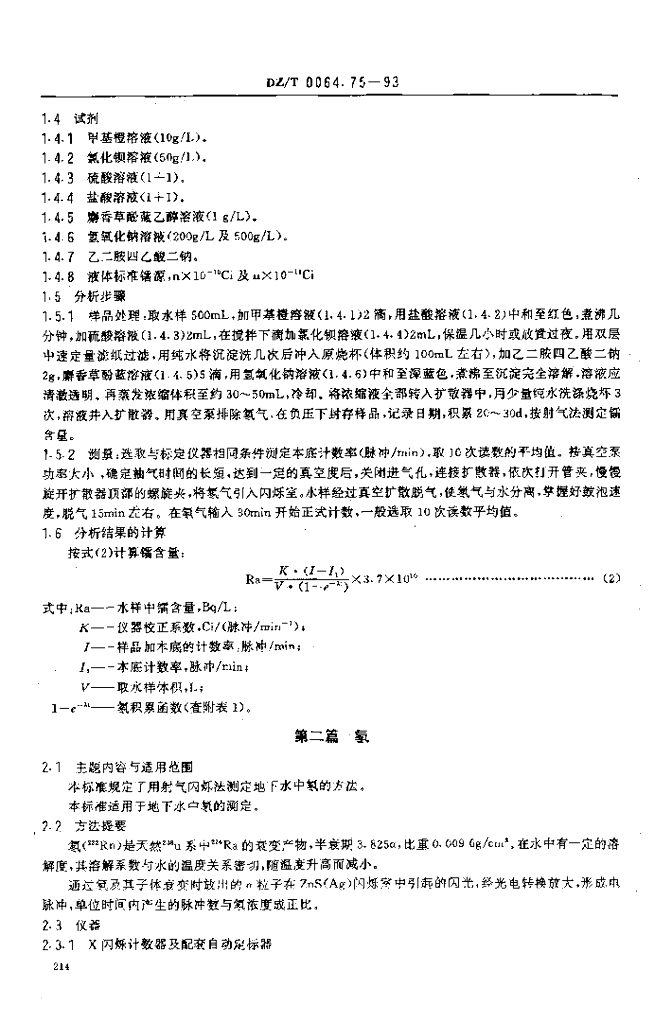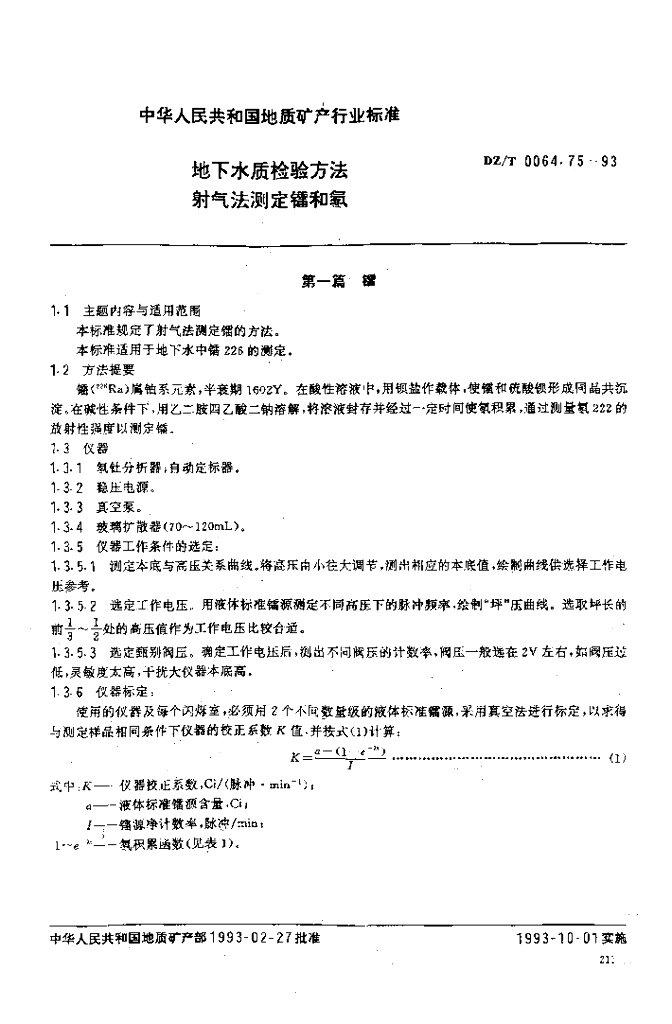 DZ/T 0064.75-1993 地下水质检验方法 射气法测定镭和氡