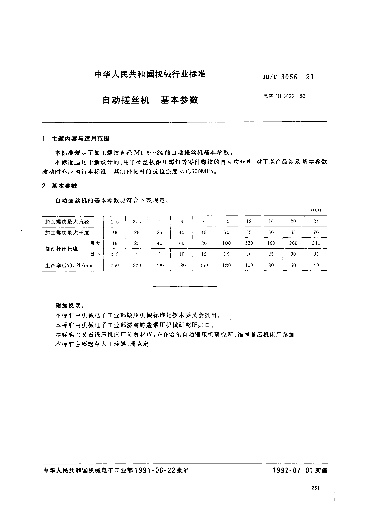 JB/T 3056-1991 自动搓丝机基本参数