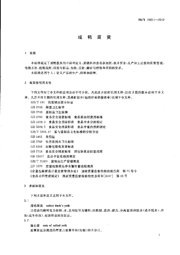 SB/T 10651-2012 咸鸭蛋黄