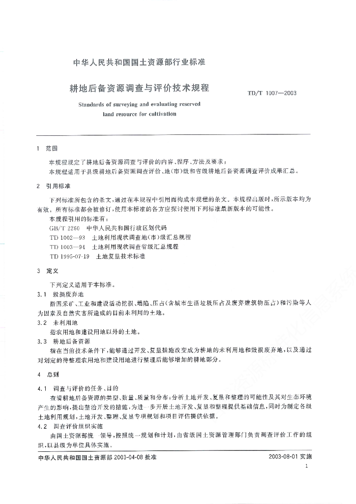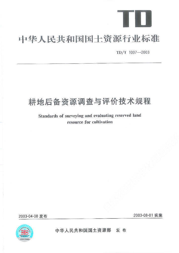 TD/T 1007-2003 耕地后备资源调查评价技术规程