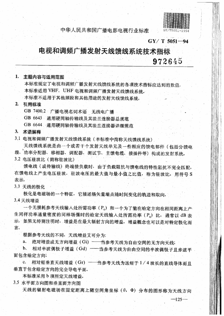 GY/T 5051-1994 电视和调频广播发射天线馈线系统技术指标