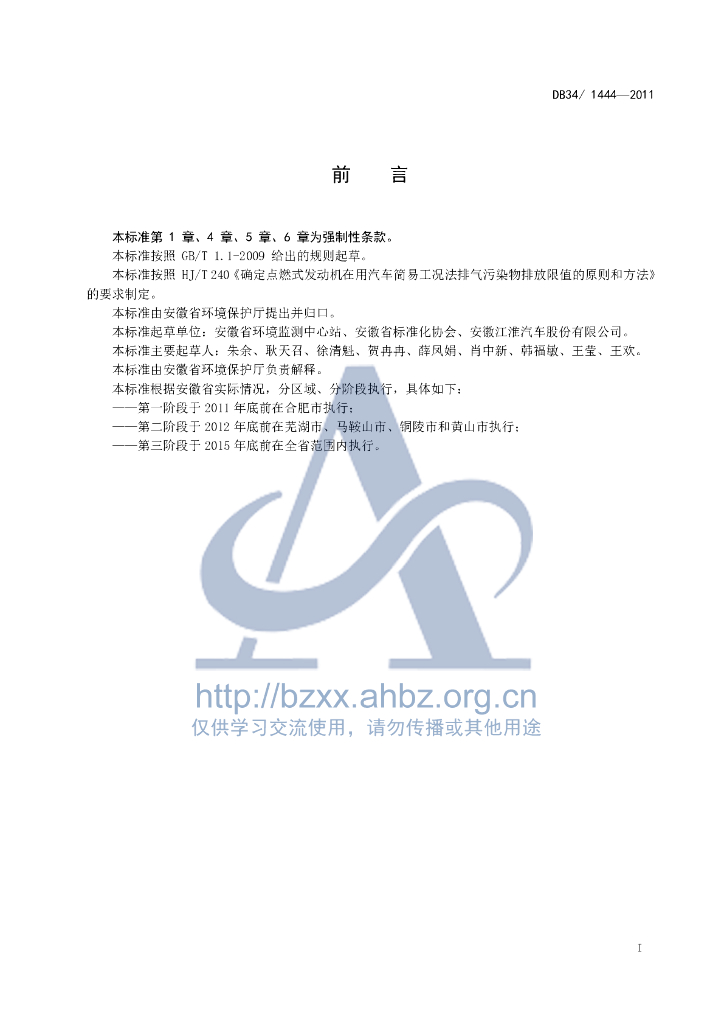 DB34/ 1444-2011 在用点燃式发动机轻型汽车稳态工况法排气污染物排放限值