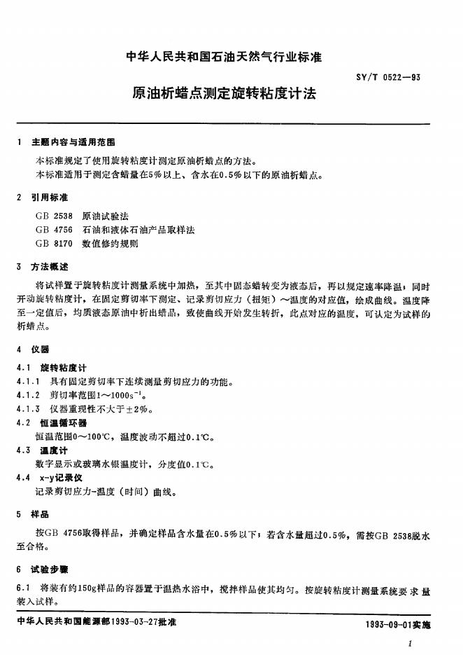 SY/T 0522-1993 原油析蜡点测定 旋转粘度计法