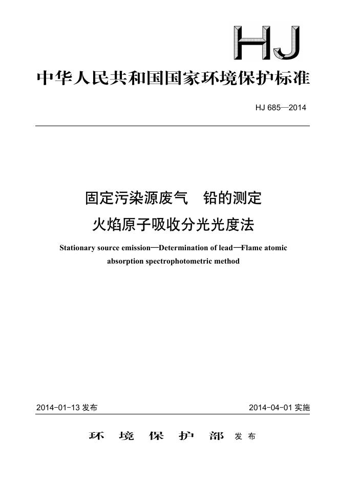HJ 685-2014 固定污染源废气 铅的测定 火焰原子吸收分光光度法
