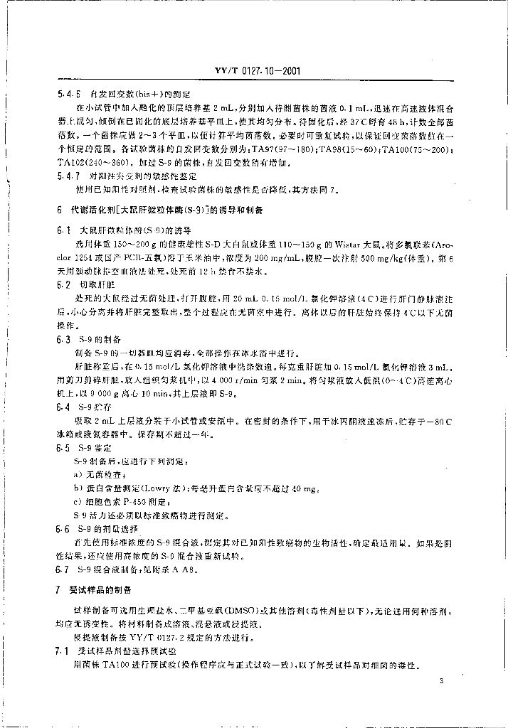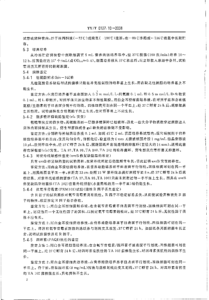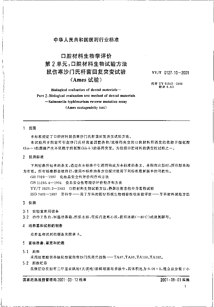 YY/T 0127.10-2001 口腔材料生物学评价 第2单元:口腔材料生物试验方法鼠伤寒沙门氏杆菌回复突变试验(Ames试验)