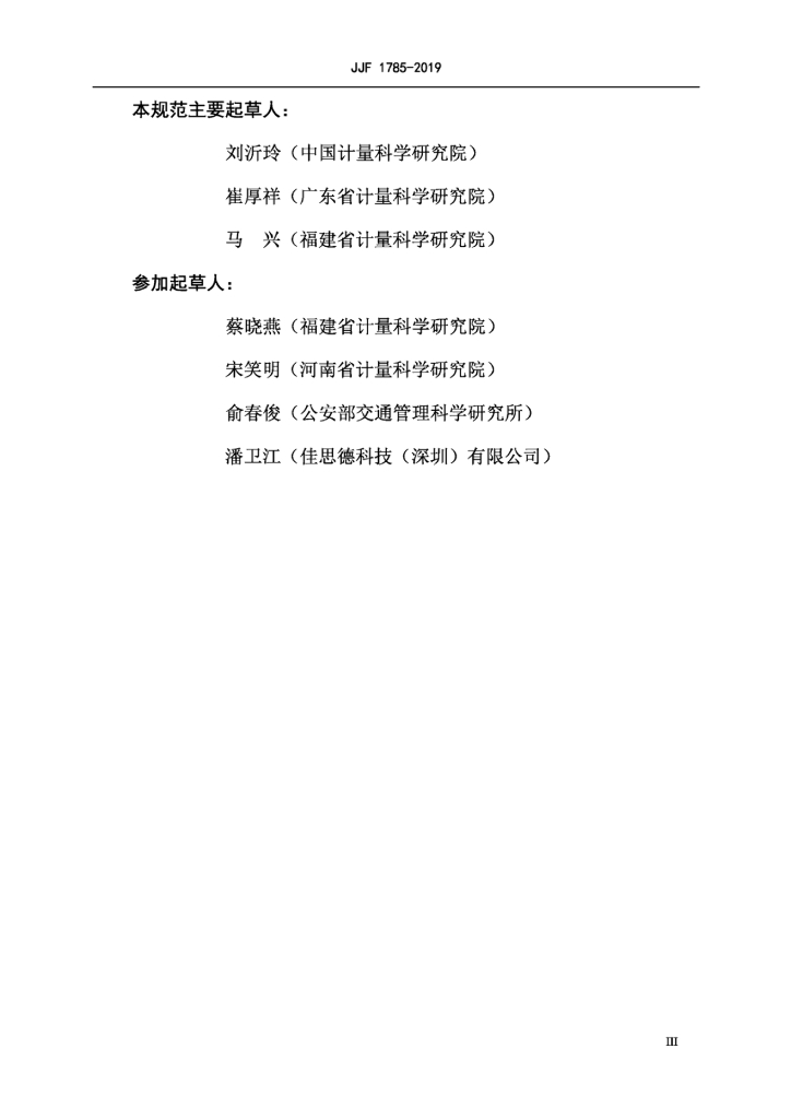 刘沂玲(中国计量科学研究院)、崔厚祥(广东省计量科学研究院)、马兴(福建省计量科学研究院)、蔡晓燕(福建省计量科学研究院)、宋笑明(河南省计量科学研究院)、俞春俊(公安部交通管理科学研究所)、潘卫江(佳思德科技(深圳)有限公司)