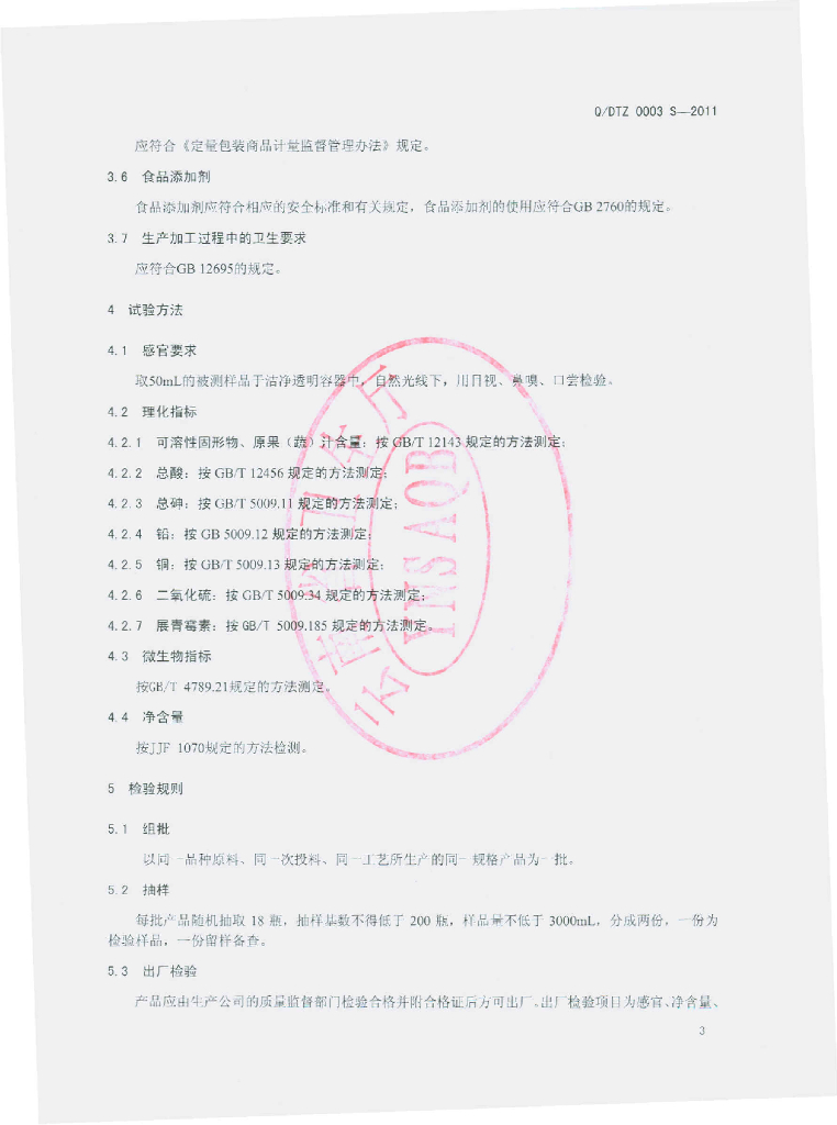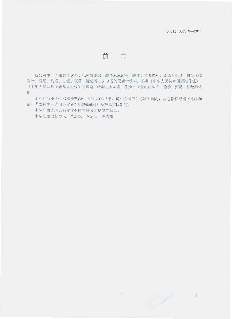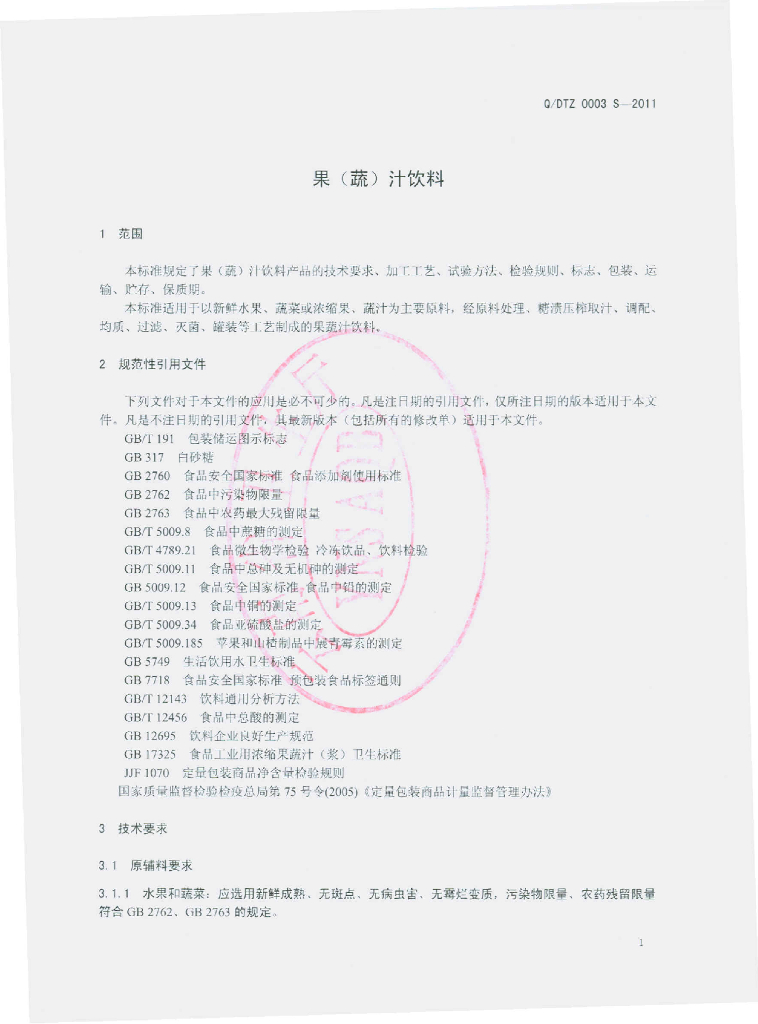 Q/DTZ 0003S-2011 果(蔬)汁饮料