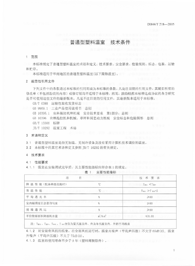 DB44/T 218-2005 普通型塑料温室 技术条件