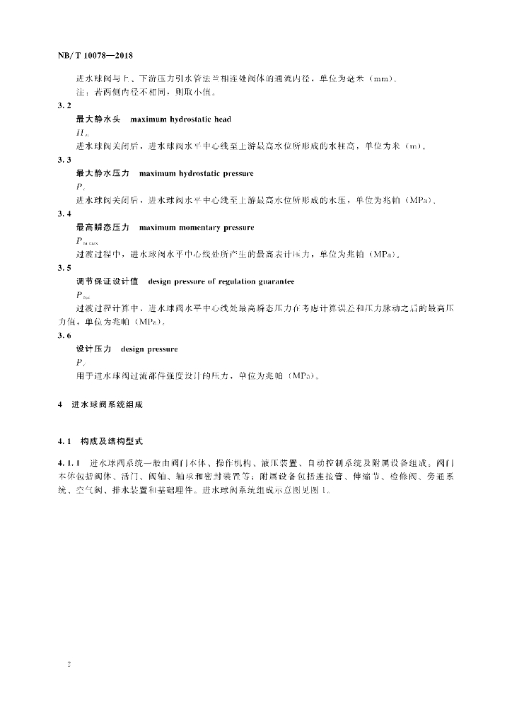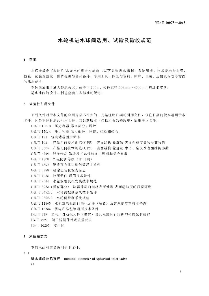 NB/T 10078-2018 水轮机进水球阀选用、试验及验收规范