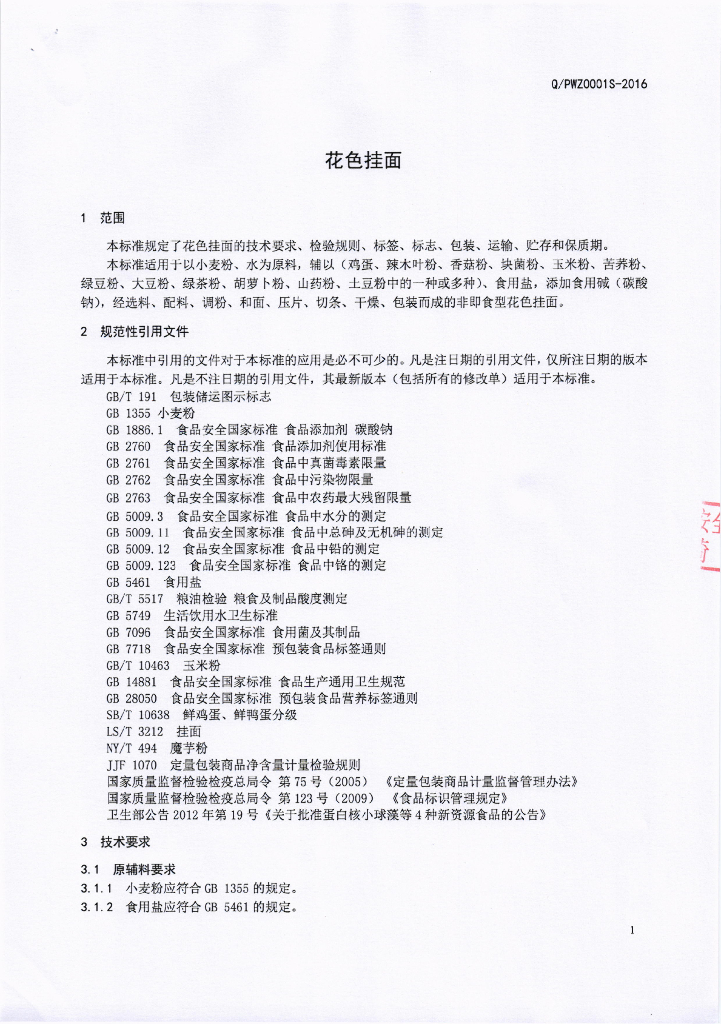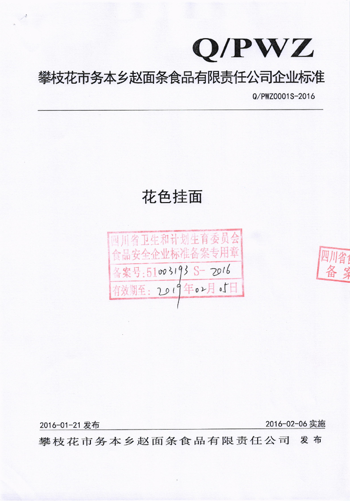 Q/PWZ 0001S-2016 攀枝花市务本乡赵面条食品有限责任公司 花色挂面