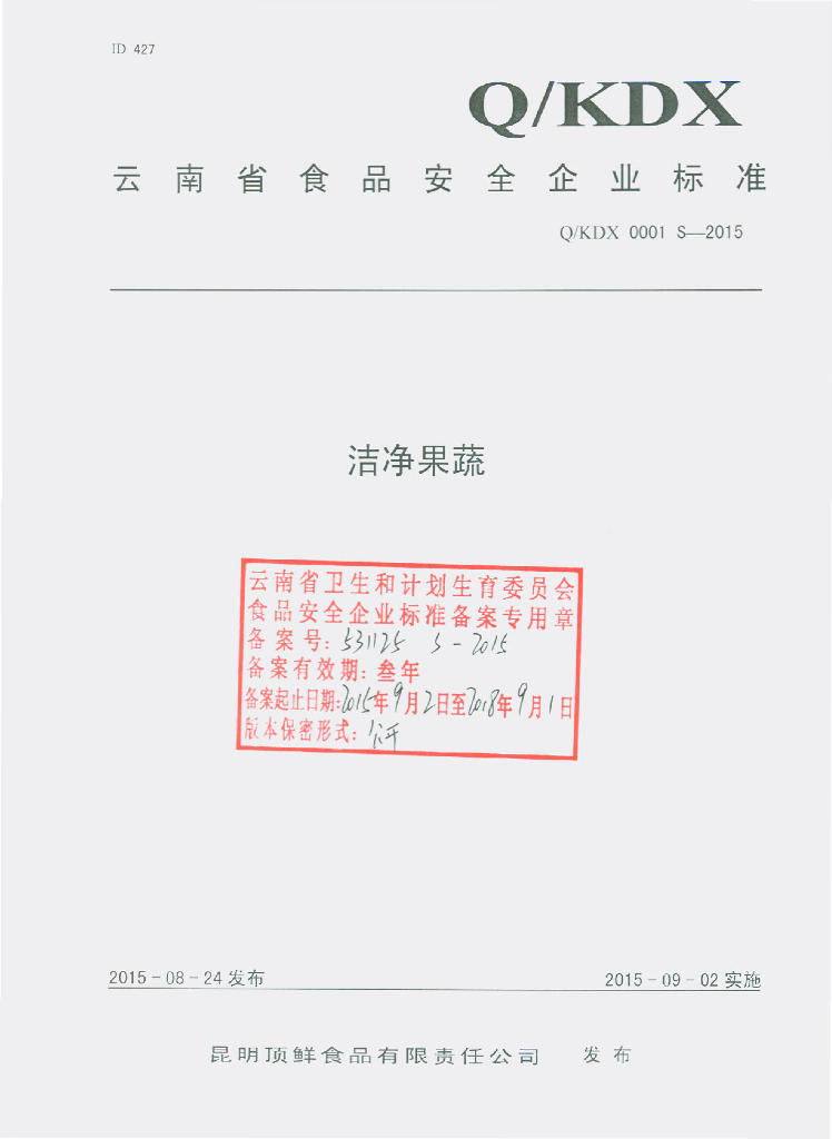 Q/KDX 0001S-2015 昆明顶鲜食品有限责任公司 洁净果蔬