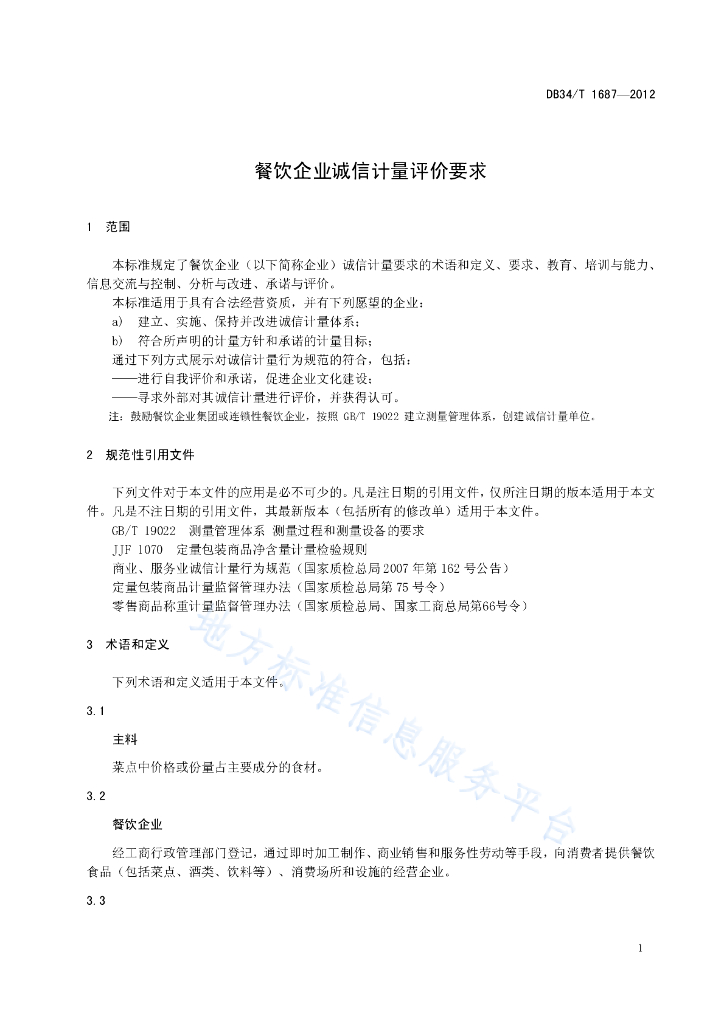 DB34/T 1687-2012 餐饮企业诚信计量评价要求