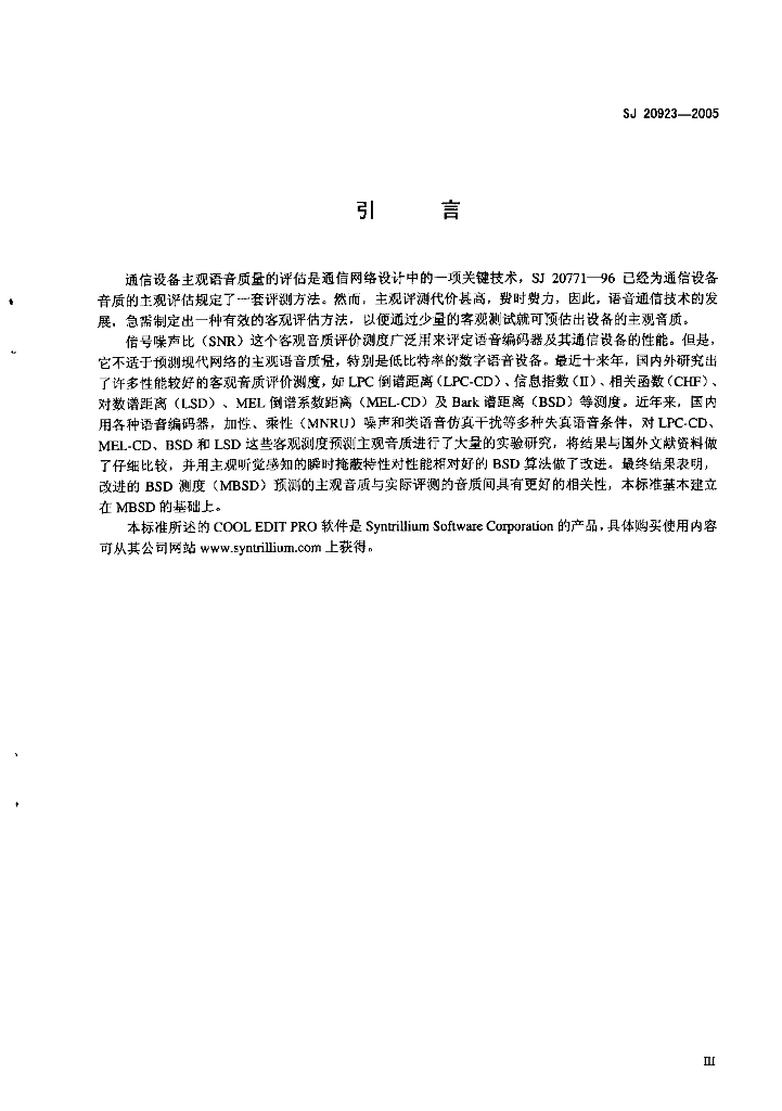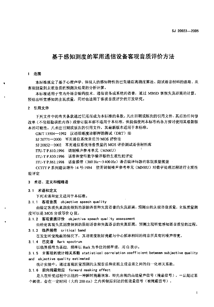 SJ 20923-2005 基于感知测度的军用通信设备客观音质评价方法