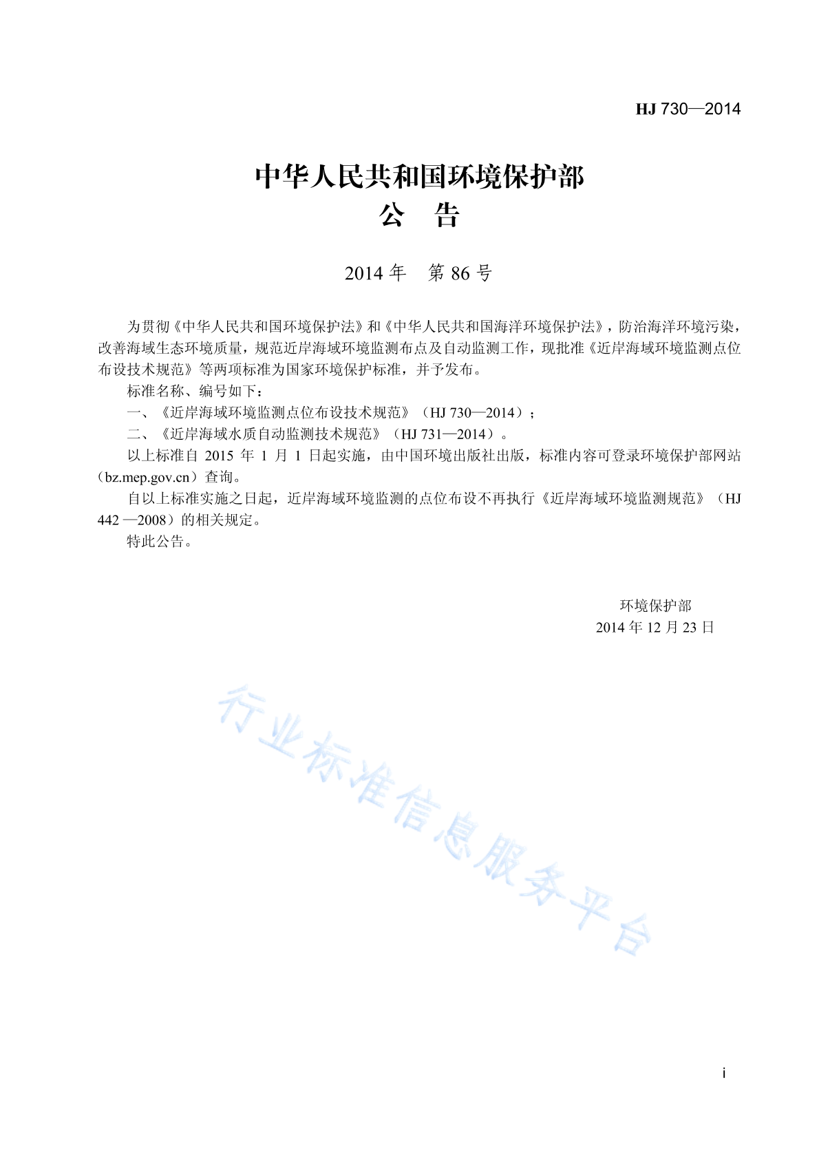 HJ 730-2014 近岸海域环境监测点位布设技术规范
