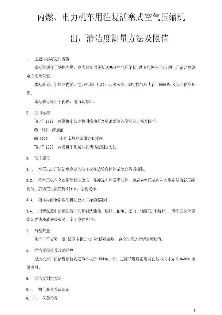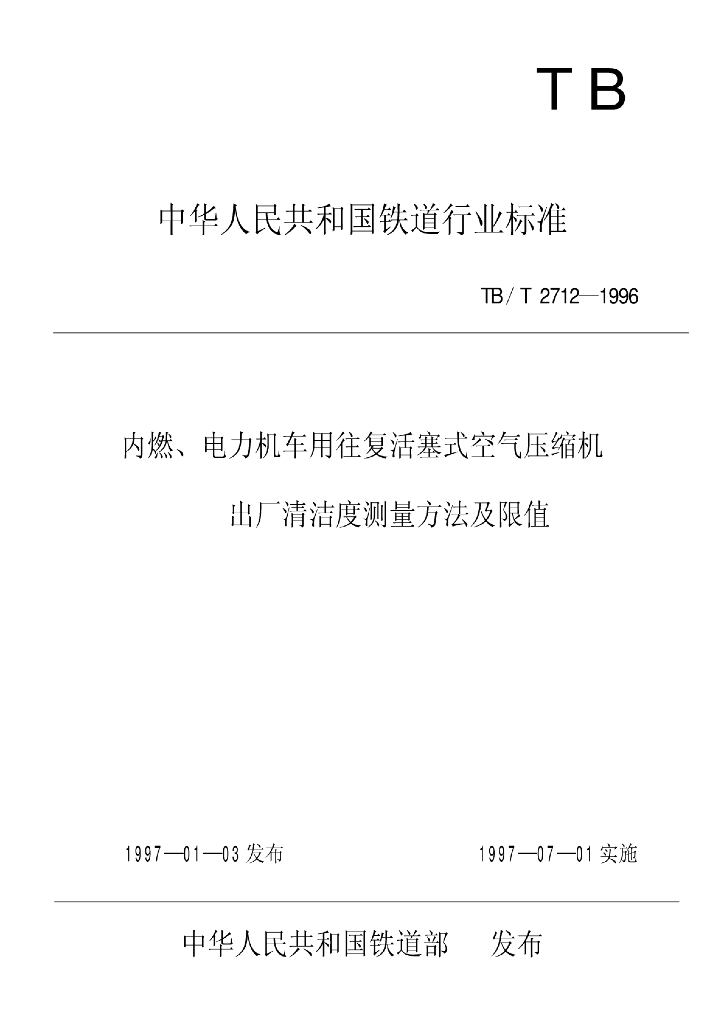 TB/T 2712-1996 内燃、电力机车用往复活塞式空气压缩机出厂清洁度测量方法及限值