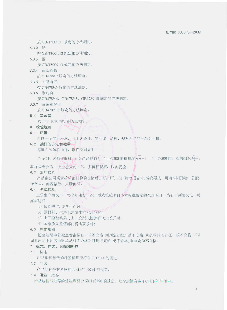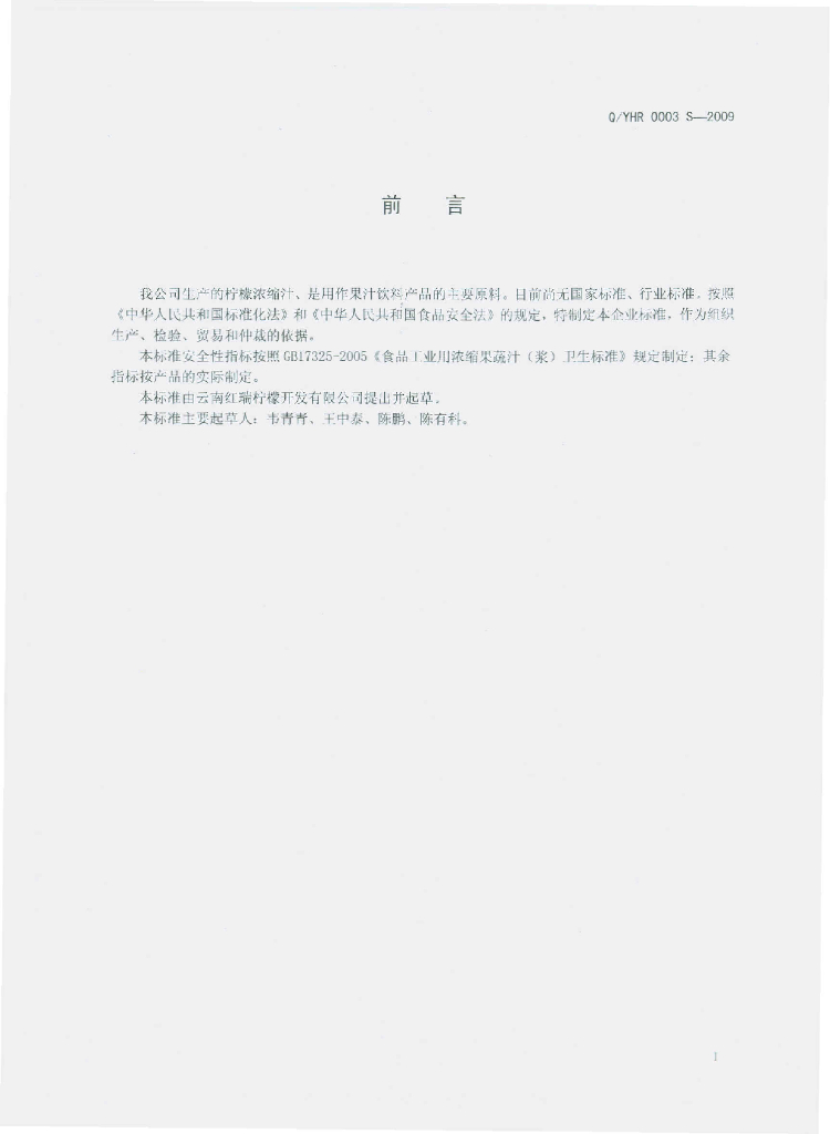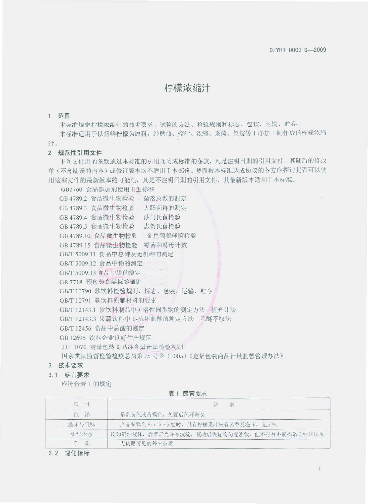 Q/YHR 0003S-2009 柠檬浓缩汁