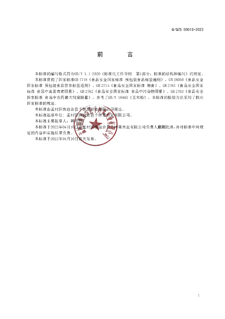 Q/QZS 0001S-2022 黄米面(黍米面)