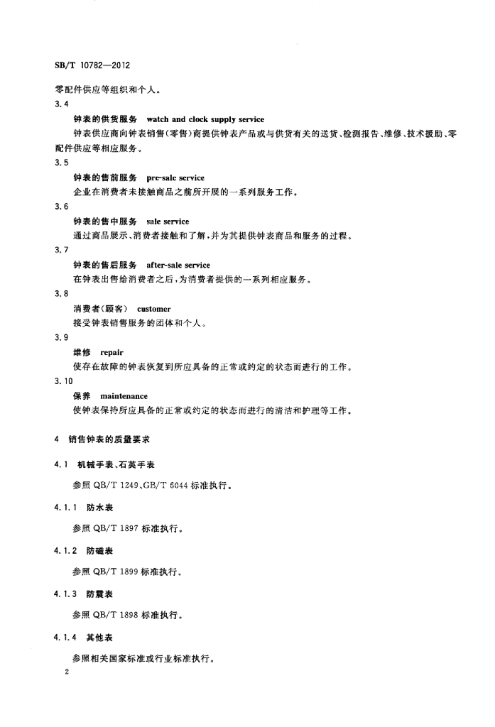 SB/T 10782-2012 钟表销售服务规范