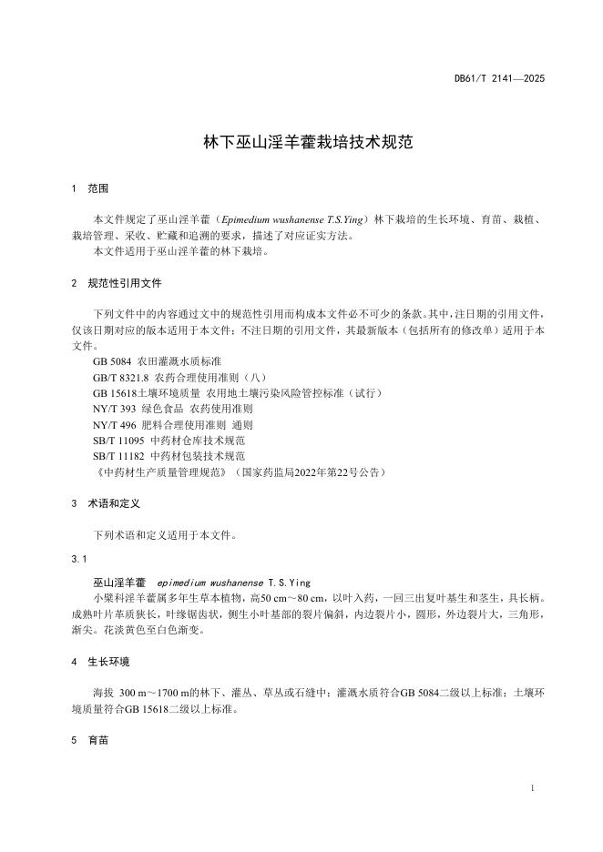 DB61/T 2141-2025 林下巫山淫羊藿栽培技术规范