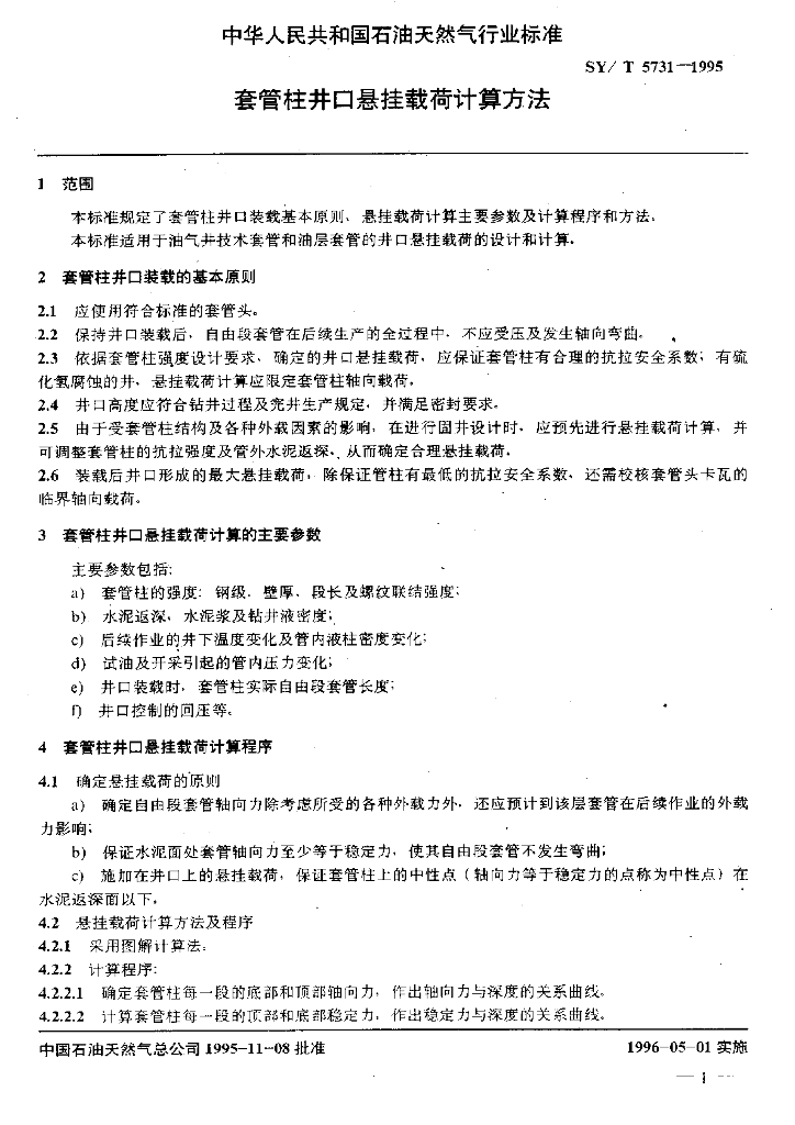 SY/T 5731-1995 套管柱井口悬挂载荷计算方法