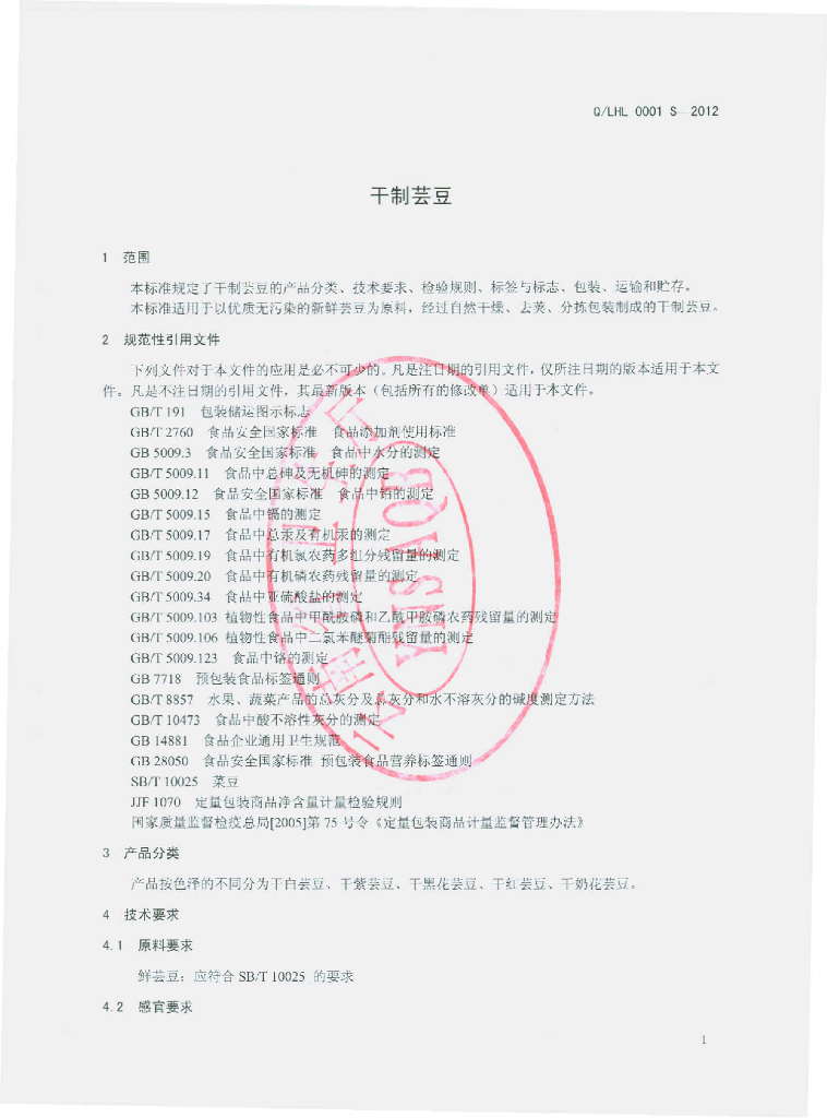 Q/LHL 0001S-2012 干制芸豆