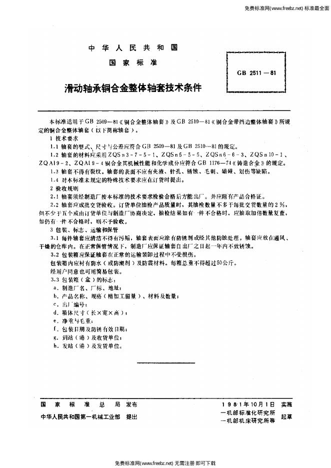 GB/T 2511-1981 滑动轴承铜合金整体轴套技术条件