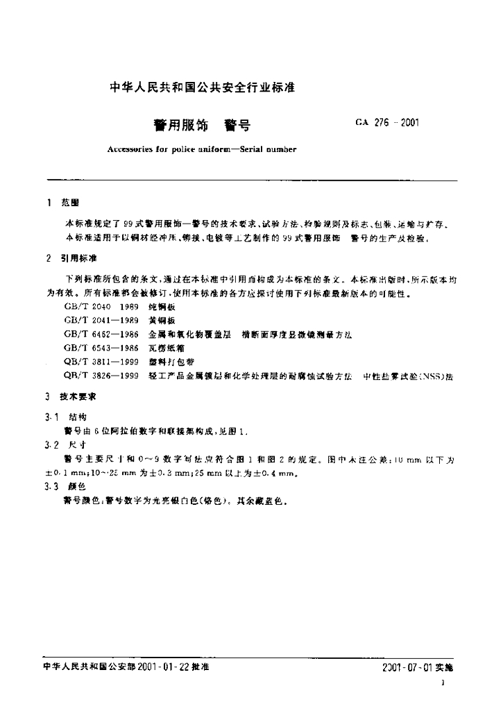 GA 276-2001 警用服饰警号
