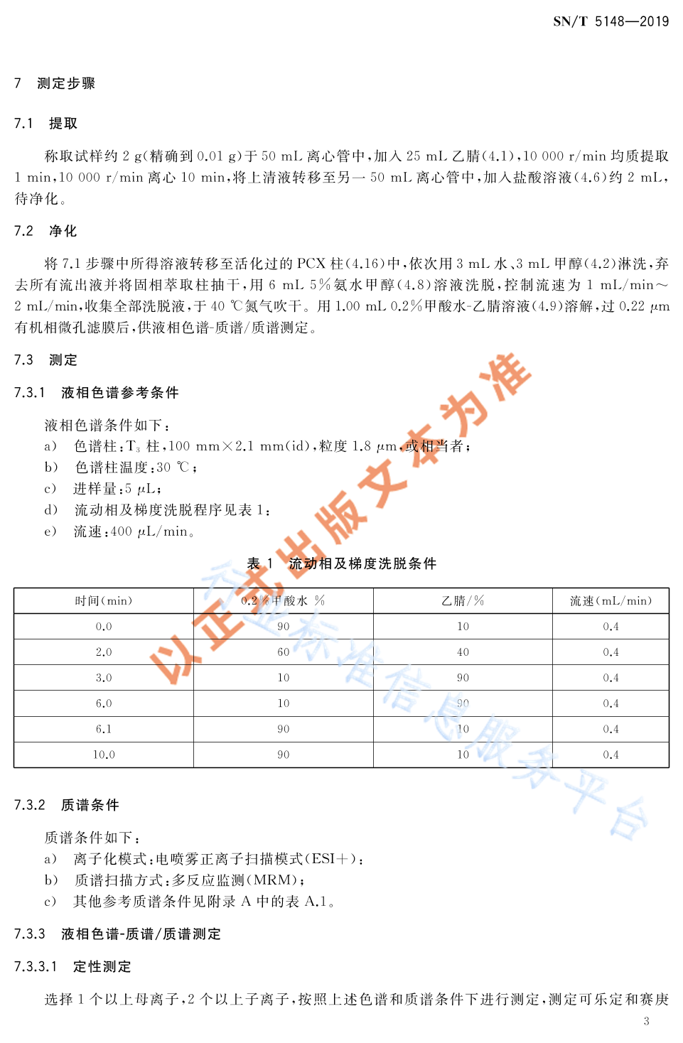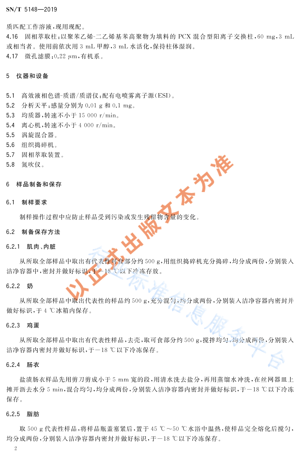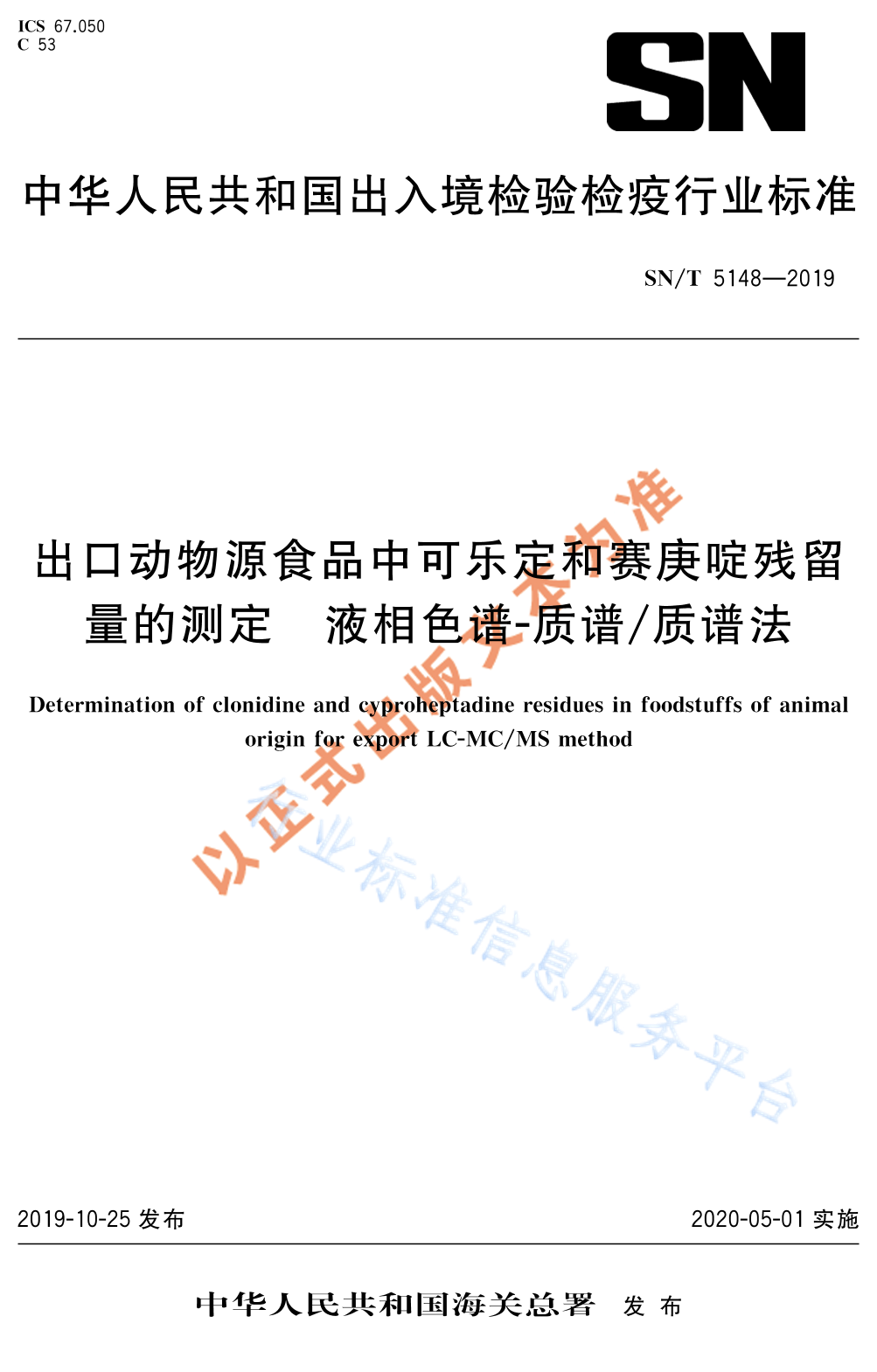 SN/T 5148-2019 出口动物源食品中可乐定和赛庚啶残留量的测定 液相色谱-质谱/质谱法