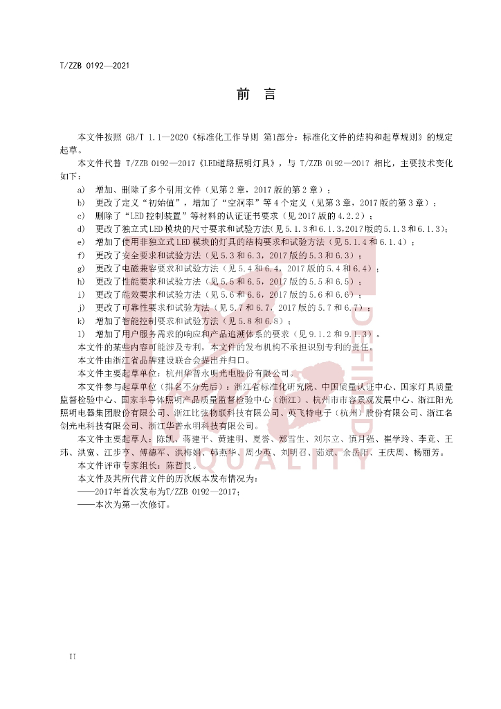 本标准由浙江省标准化研究院牵头组织制订。、本标准主要起草单位:杭州华普永明光电股份有限公司。、本标准参与起草单位:中国质量认证中心、国家灯具质量监督检验中心、浙江省半导体节能光源产品质量监督检验中心、杭州市亮灯监管中心、浙江阳光照明电器集团股份有限公司、浙江网新联合工程有限公司、英飞特电子(杭州)股份有限公司、UL大中华区全球市场准入业务部、浙江名创光电科技有限公司(排名不分先后)。