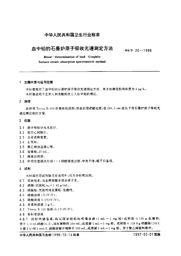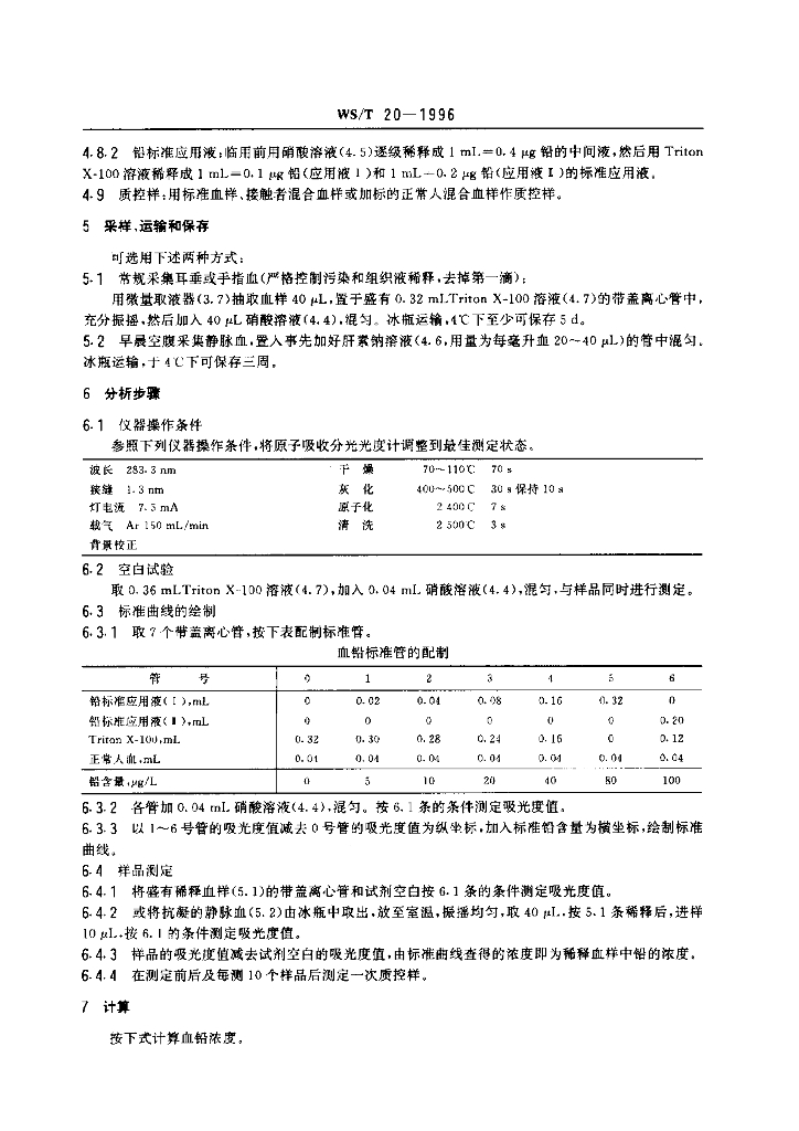 WS/T 20-1996 血中铅的石墨炉原子吸收光谱测定方法