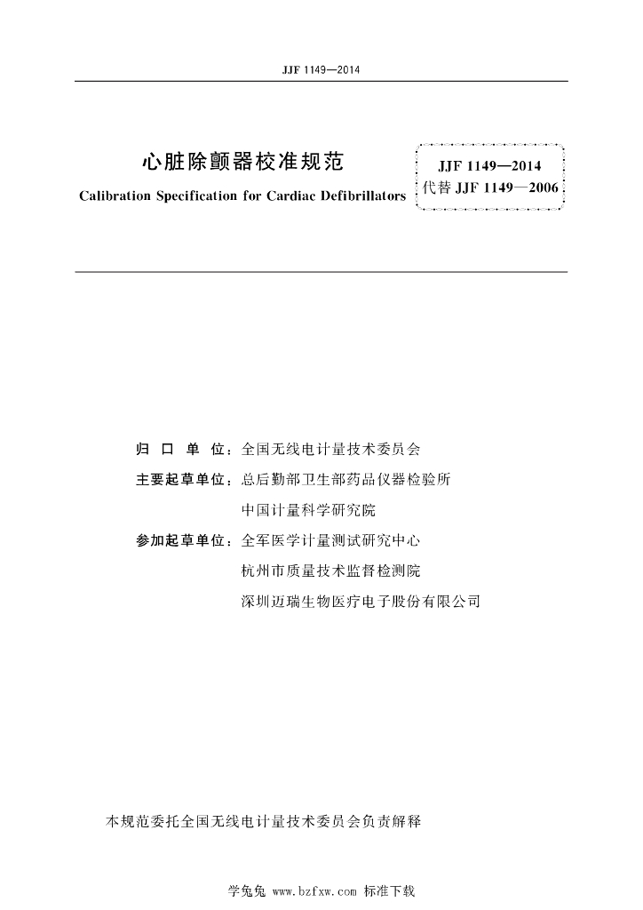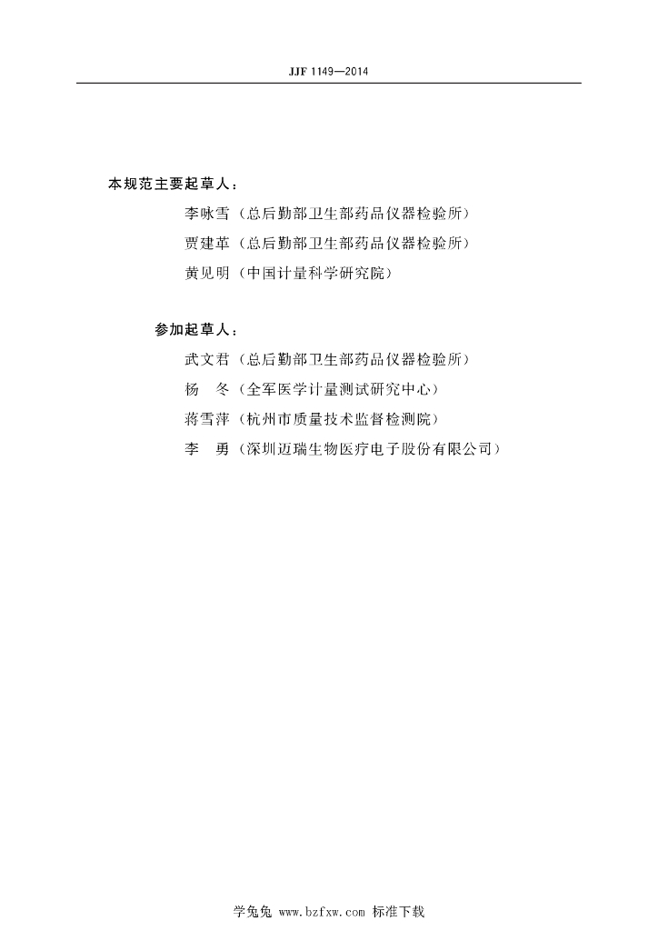李咏雪(总后勤部卫生部药品仪器检验所)、贾建革(总后勤部卫生部药品仪器检验所)、黄见明(中国计量科学研究院)、武文君(总后勤部卫生部药品仪器检验所)、杨冬(全军医学计量测试研究中心)、蒋雪萍(杭州市质量技术监督检测院)、李勇(深圳迈瑞生物医疗电子股份有限公司)