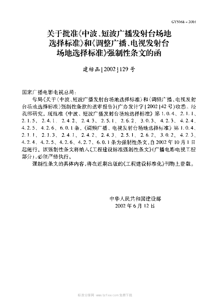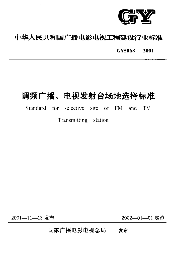 GY 5068-2001 调频广播、电视发射台场地选择标准