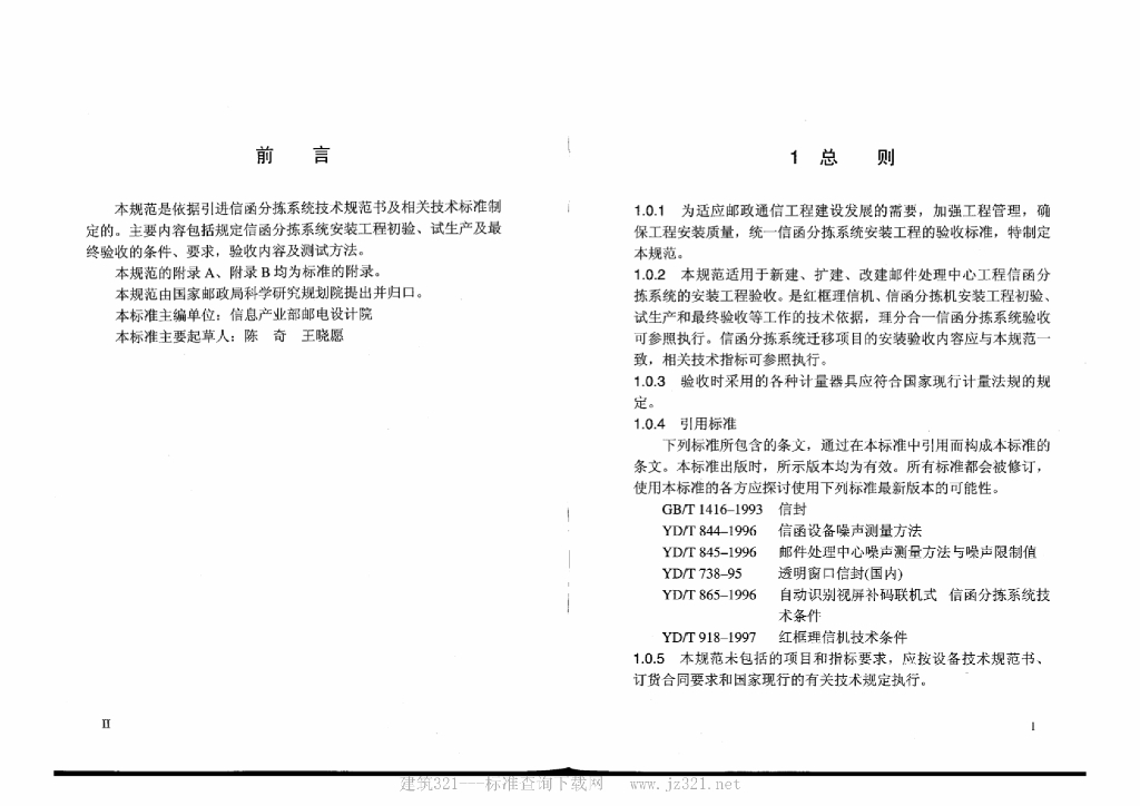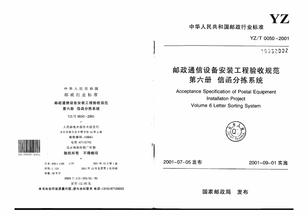 YZ/T 0050-2001 邮政通信设备安装工程验收规范 第六册信函分拣系统