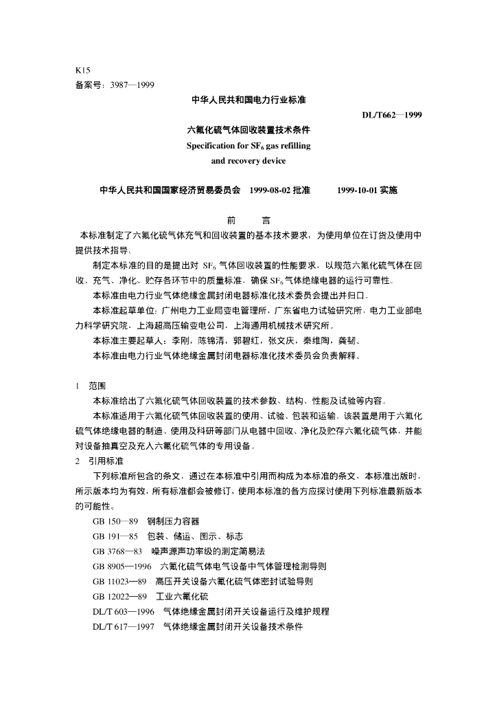 DL/T 662-1999 六氟化硫气体回收装置技术条件