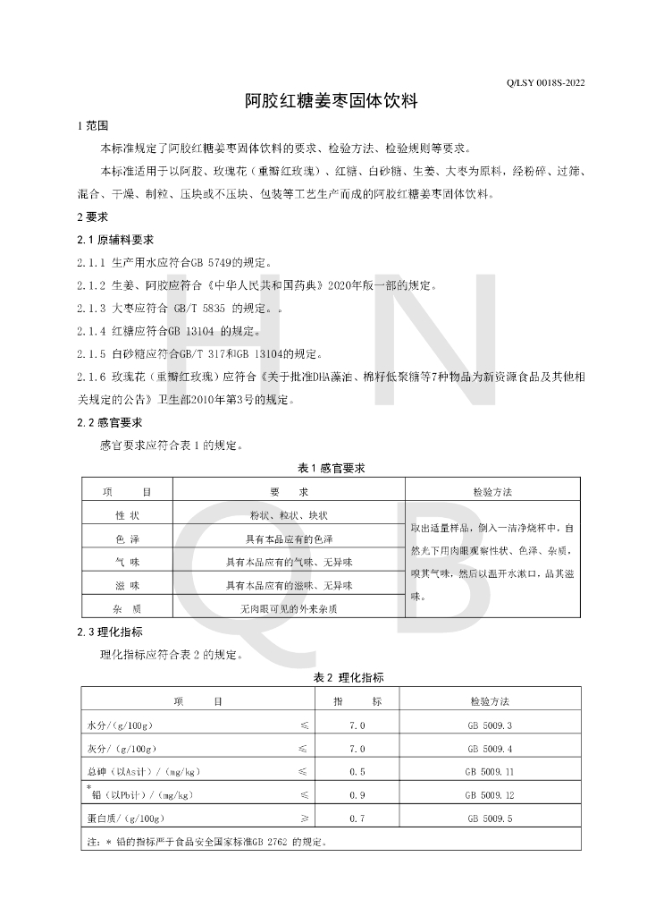 Q/LSY 0018S-2022 阿胶红糖姜枣固体饮料